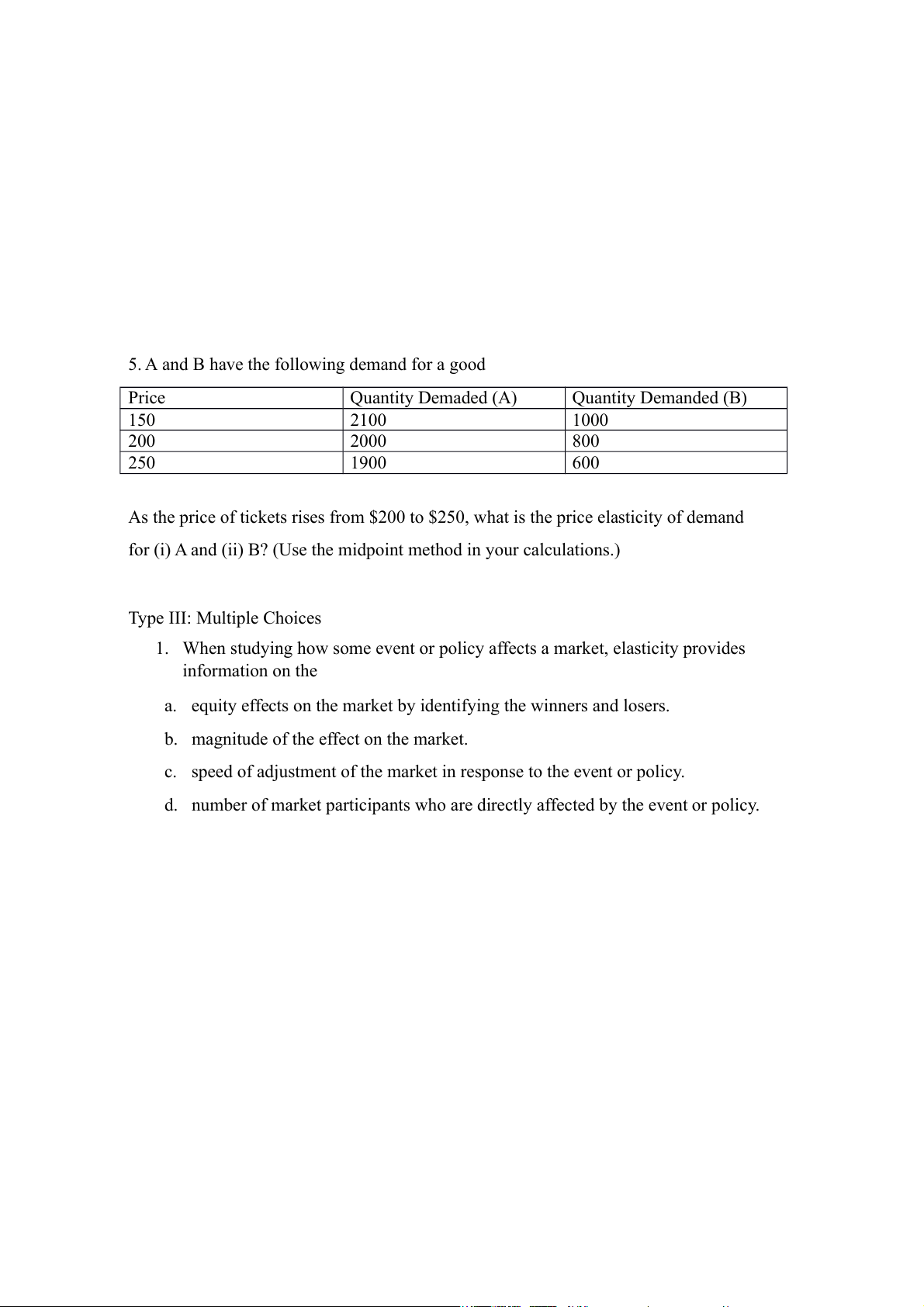 for (i) A and (ii) B? (Use the midpoint method in your calculations.) Type III: Multiple Choices