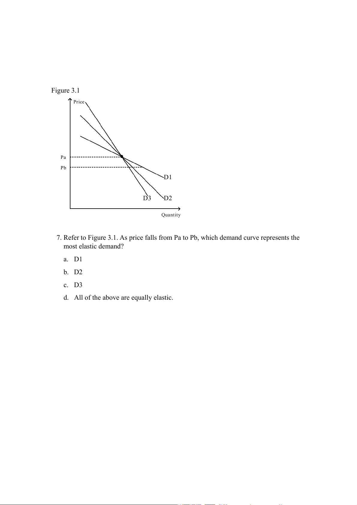 7. Refer to Figure 3.1. As price falls from Pa to Pb, which demand curve represents the most elastic demand? a. D1 b. D2 c. D3