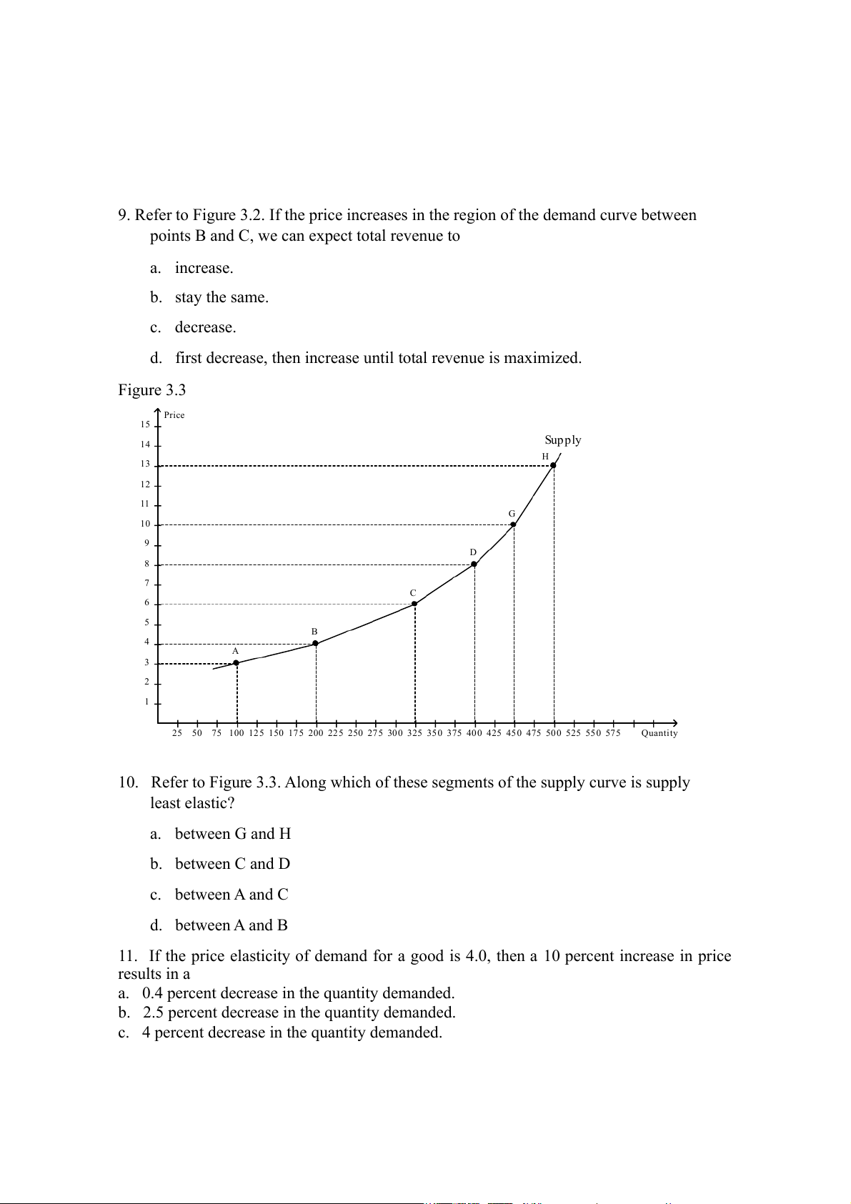 10. Refer to Figure 3.3. Along which of these segments of the supply curve is supply least elastic? a. between G and H b. between C and D c. between A and C d. between A and B