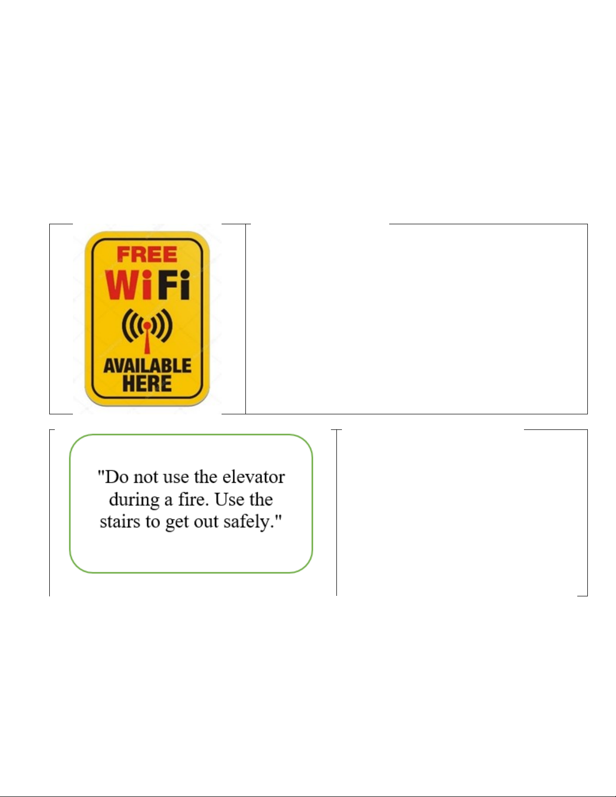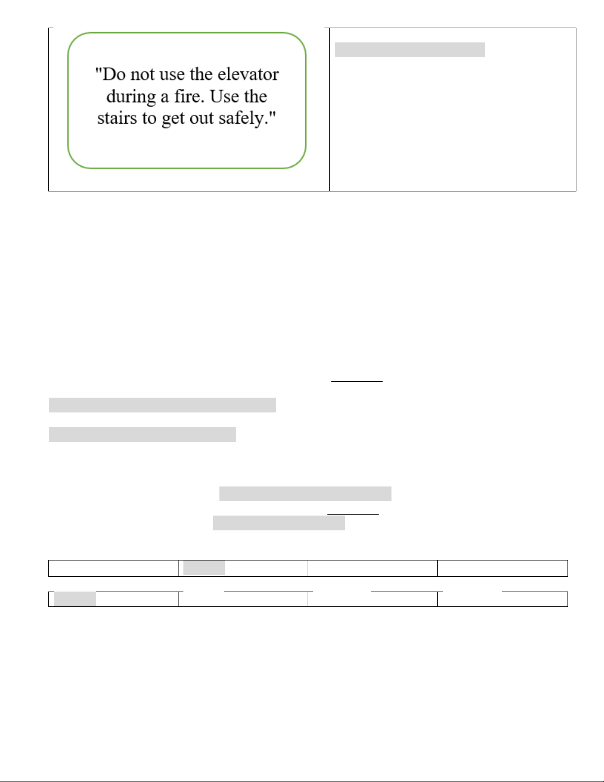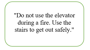 | A. Use the elevator during a fire B. Use the stairs during a fire C. Stay in the building during a fire D. Exit through the windows |