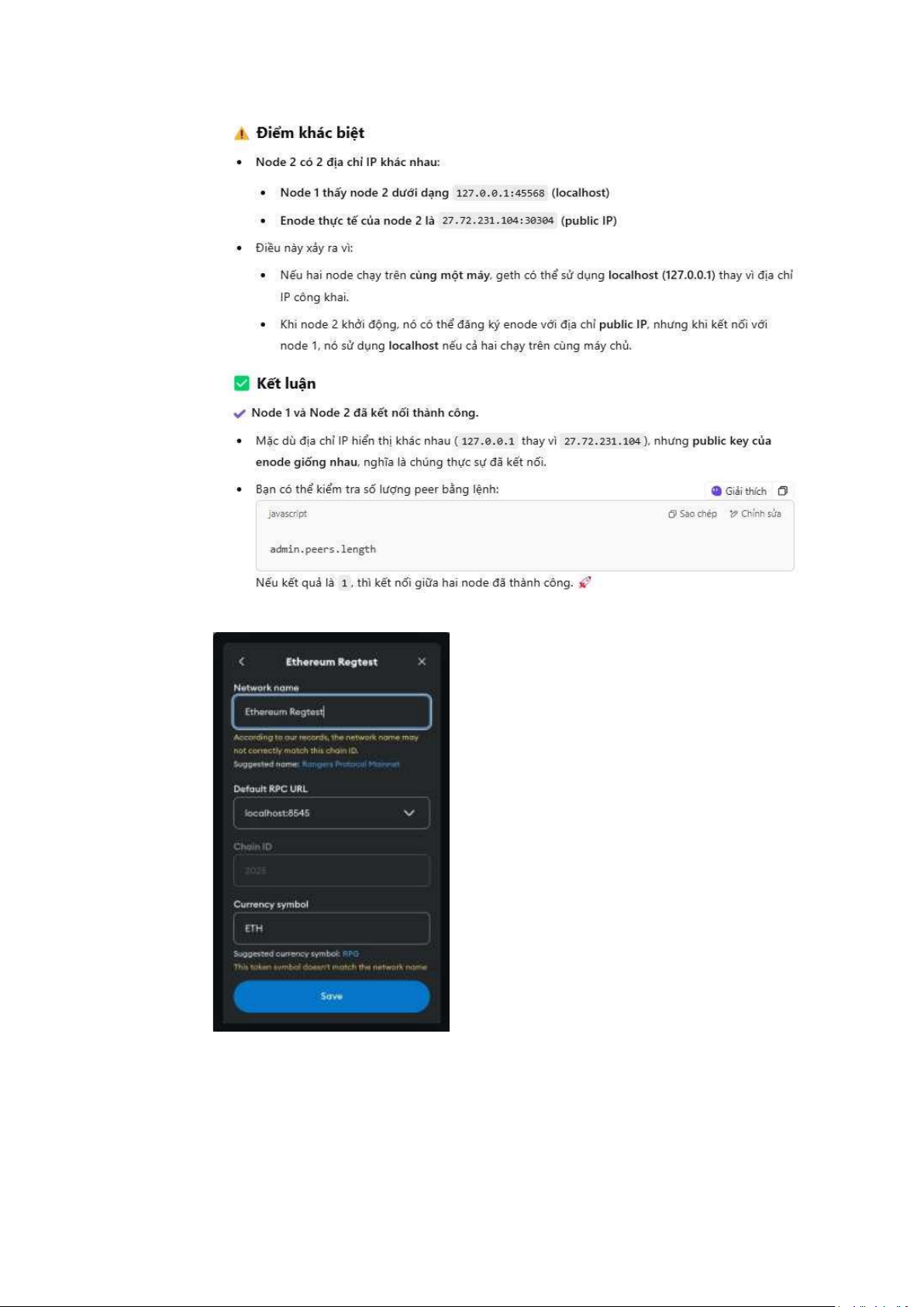 Được: Public address of the key: 0x996666fc65DDda3df6e738e5341c469e391d580f Lấy enode của node1 Chạy node2 Ở node1 lOMoAR cPSD| 58833082 Ở node2 lOMoAR cPSD| 58833082 Kết nối MetaMask