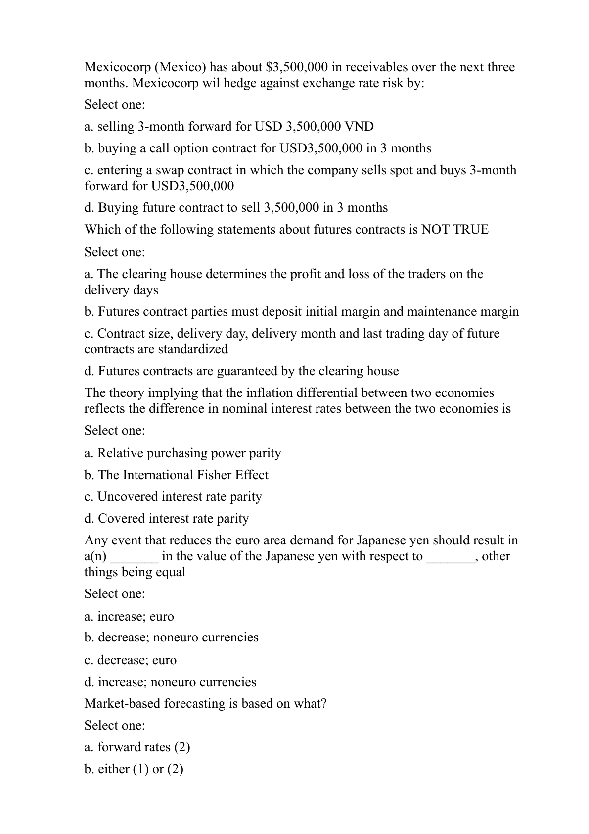 months. Mexicocorp wil hedge against exchange rate risk by: Select one: