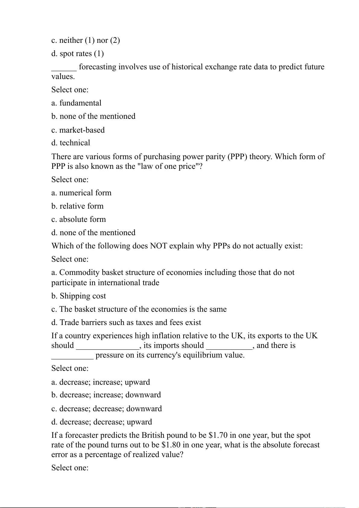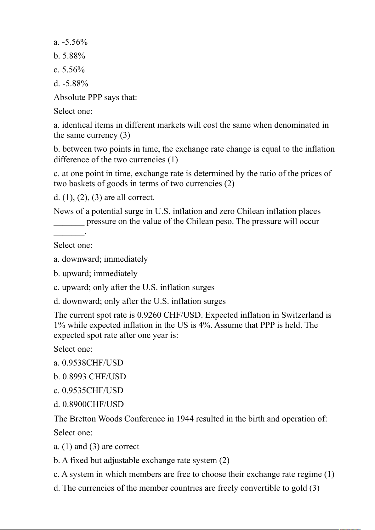 error as a percentage of realized value? Select one: a. -5.56% b. 5.88% c. 5.56% d. -5.88% Absolute PPP says that: Select one:
