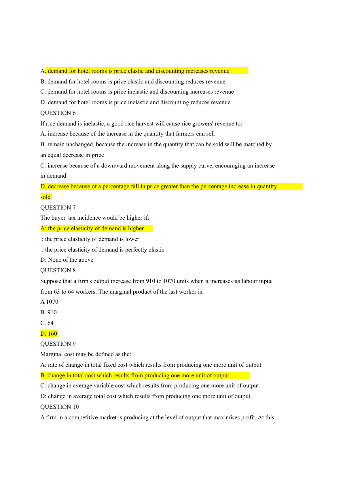 D. demand for hotel rooms is price inelastic and discounting reduces revenue QUESTION 6