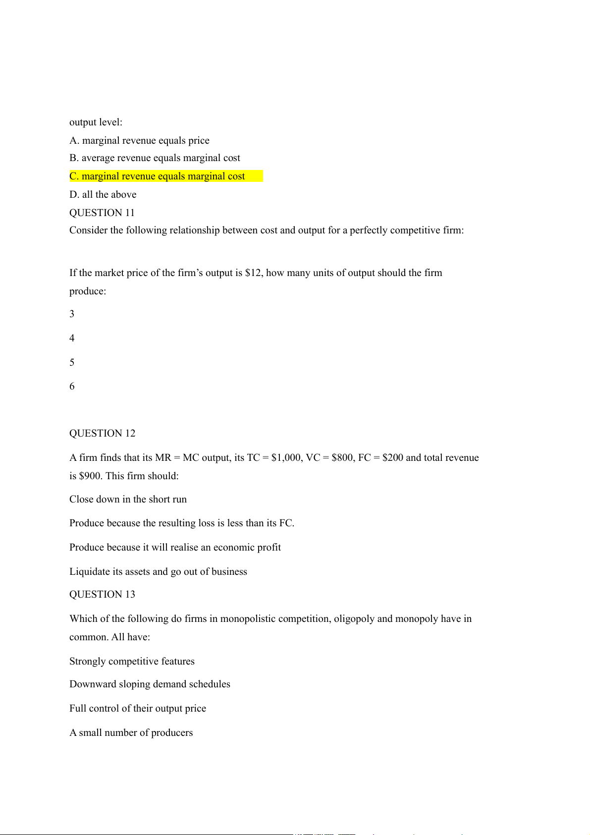 C. marginal revenue equals marginal cost D. all the above QUESTION 11