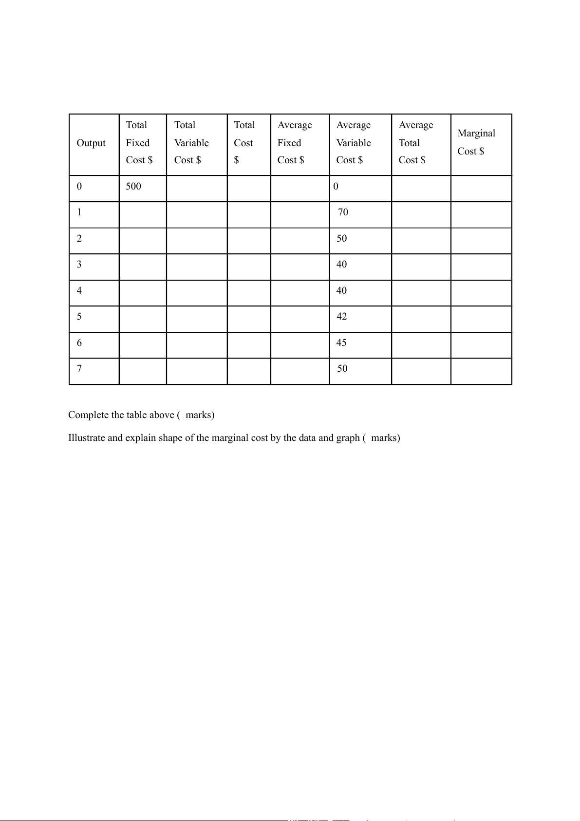 The table below includes Mr Chang's firm's short run cost data. Total Total Total Average Average Average Marginal Output Fixed Variable Cost Fixed Variable Total Cost $ Cost $ Cost $ $ Cost $ Cost $ Cost $ 0 500 0 1 70 2 50 3 40 4 40 5 42 6 45 7 50