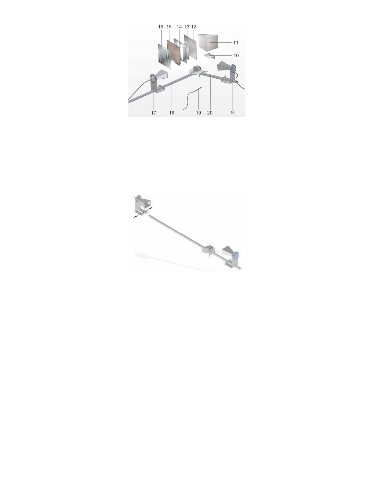 (12) reflection plate. (13) cover plate for double slit, (14) plate with double slit. (15) absorption