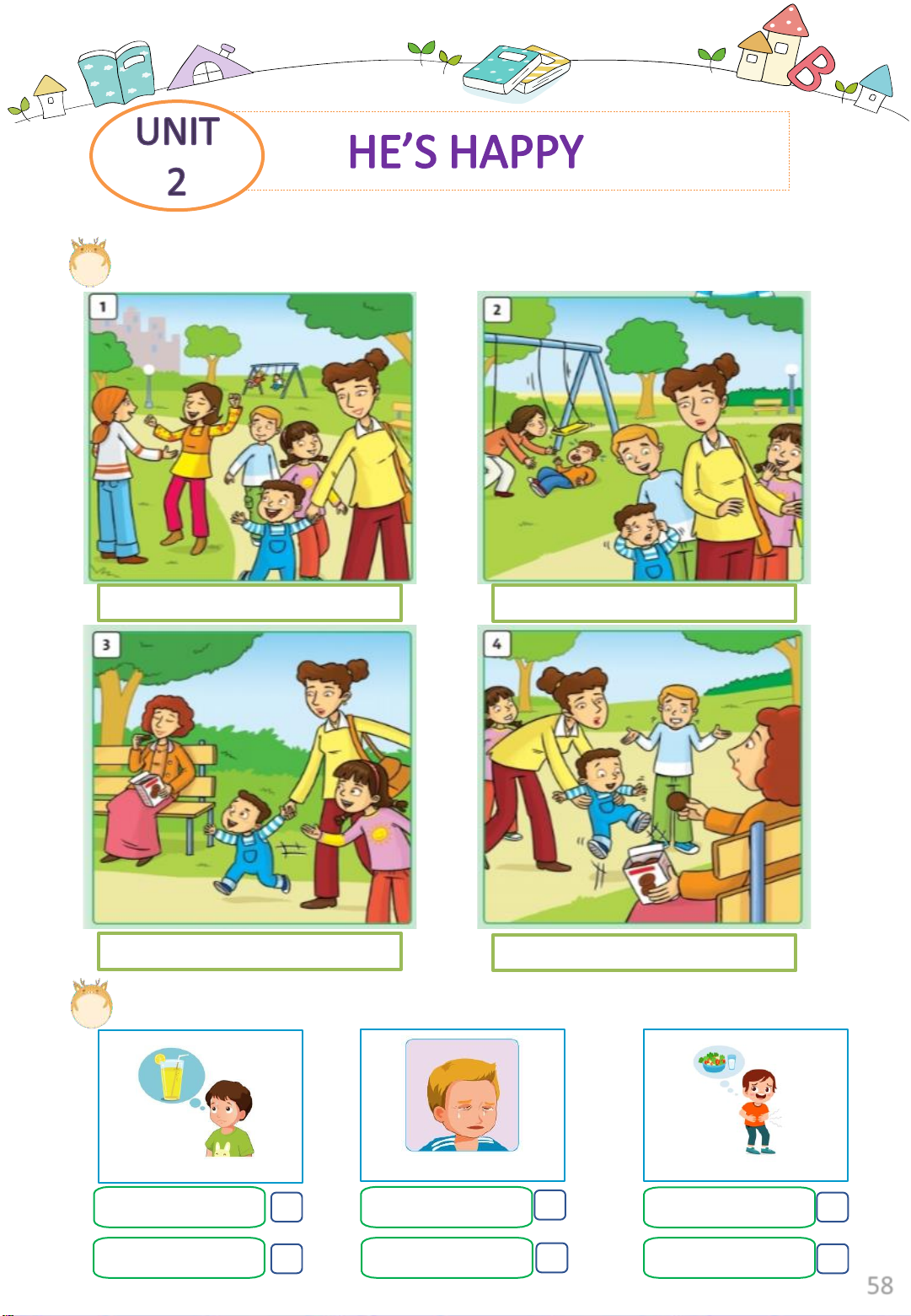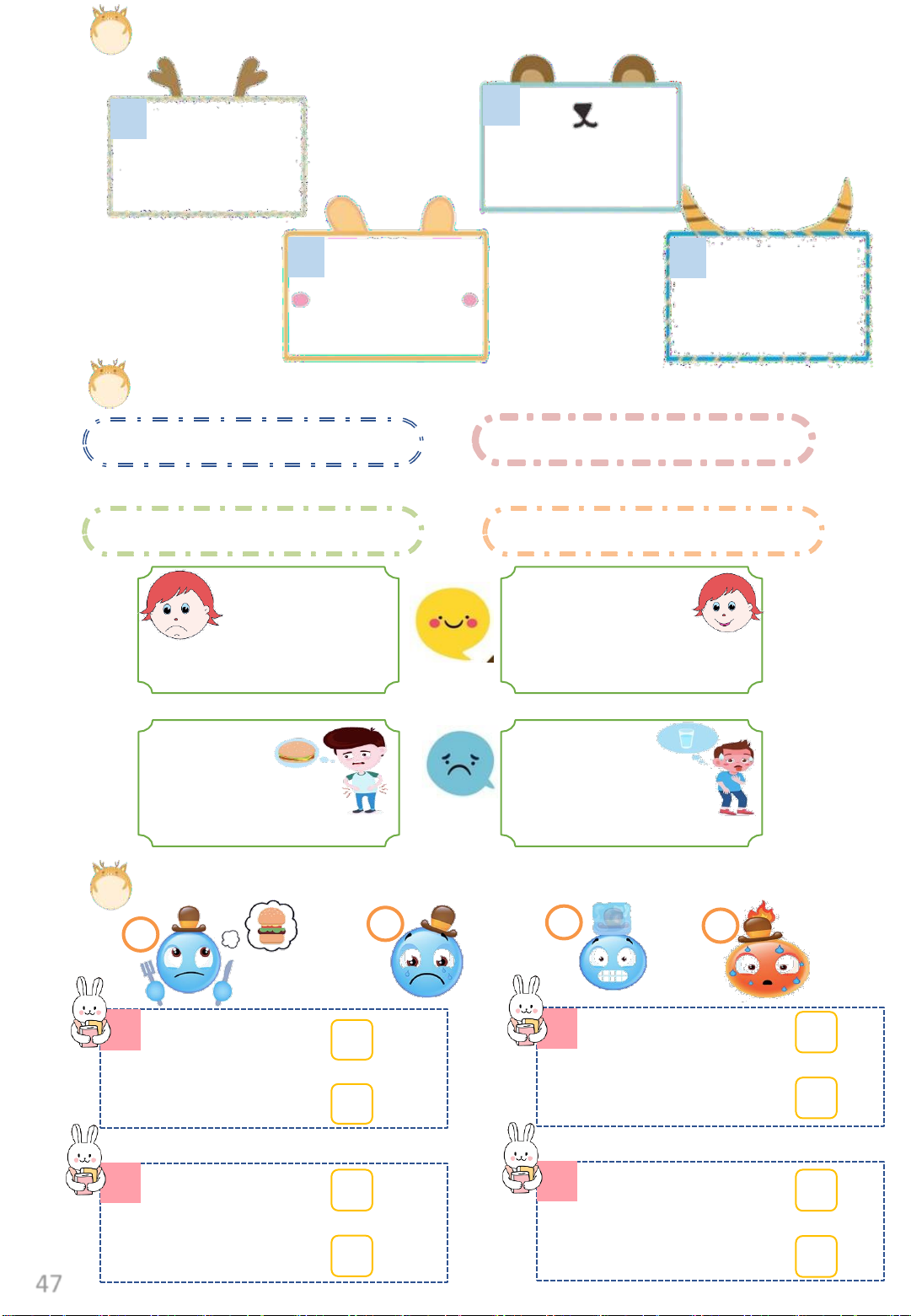 Exercise 2: Listen and tick or cross. 1 2 3 4 Exercise 3: Read and number. 1 She’s happy. 2 He’s hot. 3 She’s hungry. 4 He’s thirsty. 46 Exercise 4: Listen and write. 1 2 …………………… …………………… 3 4 …………………… ……………………