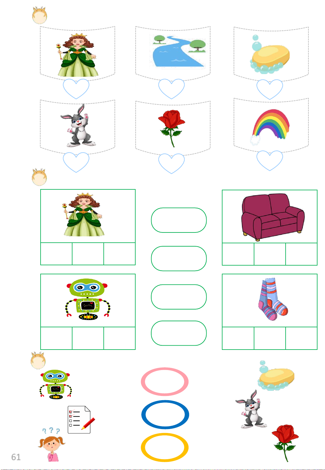 Exercise 5: Look, write and match. Rr ----oap ----obot Ss ----abbit ----uiz Qq 61 ----uestion ----ose Exercise 6: Count and circle