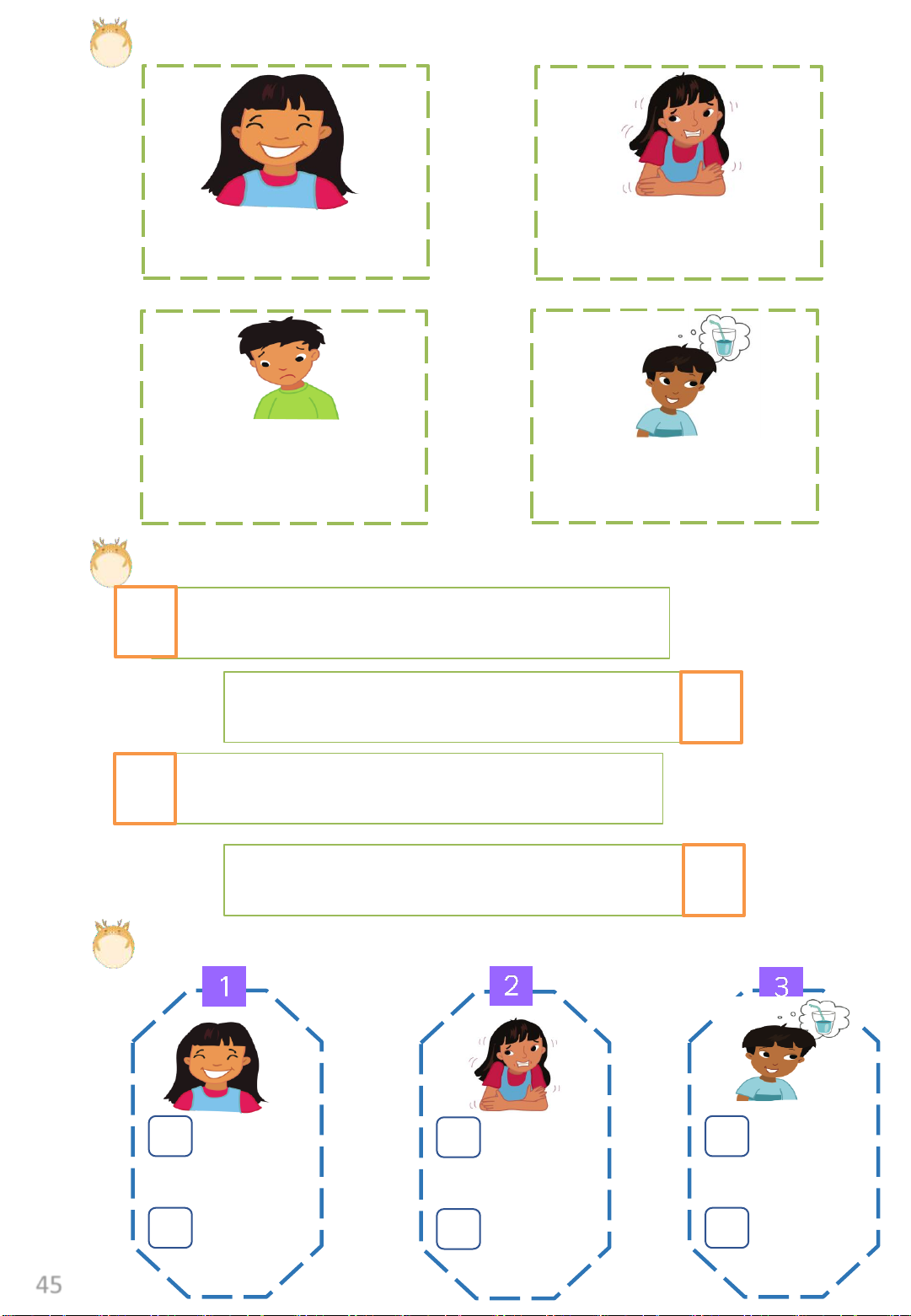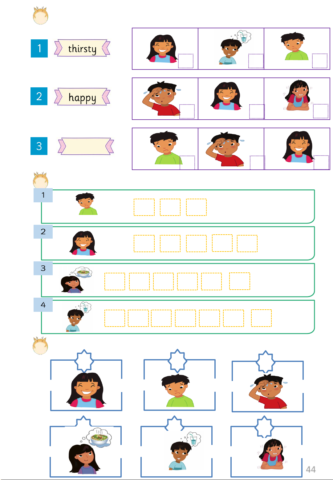 Exercise 5: Listen and numbers. 44 Exercise 6: Look and circle. Happy / sad hot / cold sad / hungry thirsty / hungry Exercise 7: Listen and write. 1