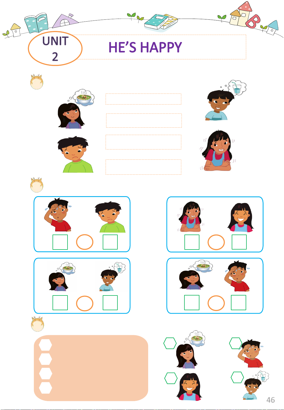 Exercise 8: Look and tick or cross. hungry hot hungry happy cold thirsty 45 LESSON 2 Grammar and song Exercise 1: Look and match. She’s hungry She’s cold He’s sad He’s thirsty