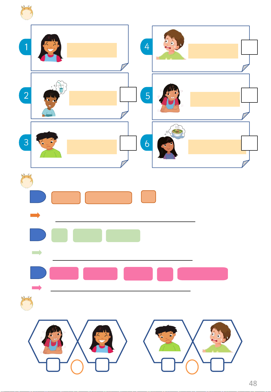 Exercise 6: Look. Tick the correct sentence. 1 2 3 4 1 2 I’m hungry I’m sad I’m thirsty I’m happy 3 4 I’m hot I’m hot I’m cold I’m thirsty 47