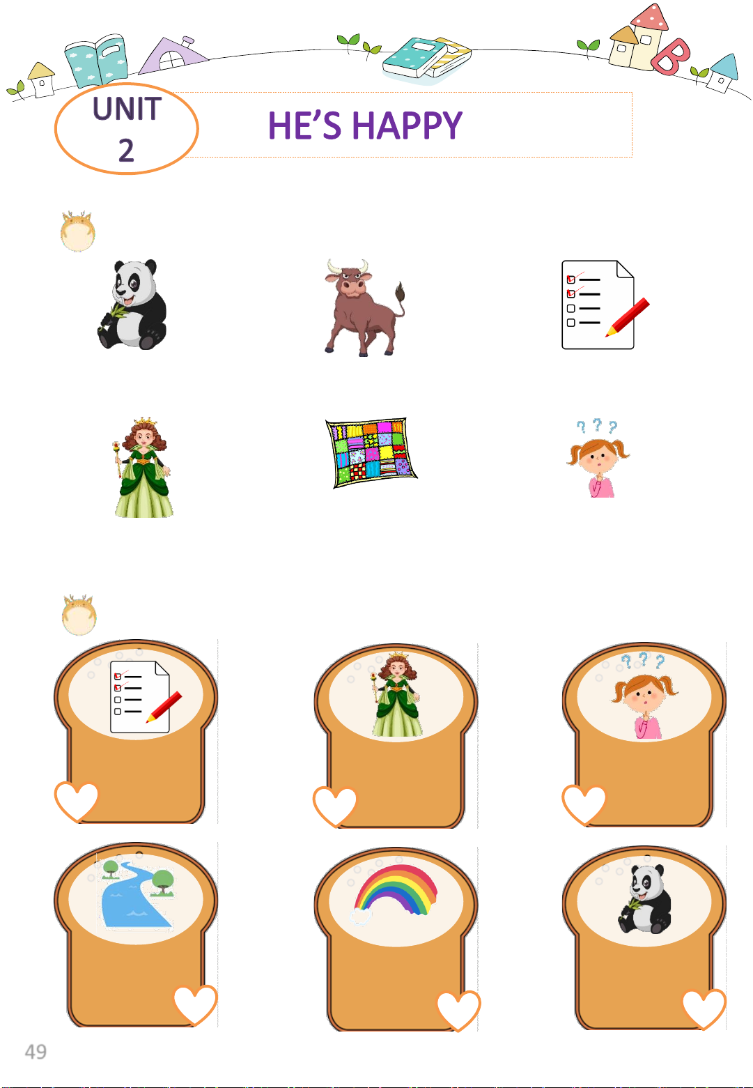 Exercise 2: Look, listen and circle. quilt quilt question 1 quiz 2 queen 3 queen quilt rainbow peach river 4 nut 5 panda 6 49