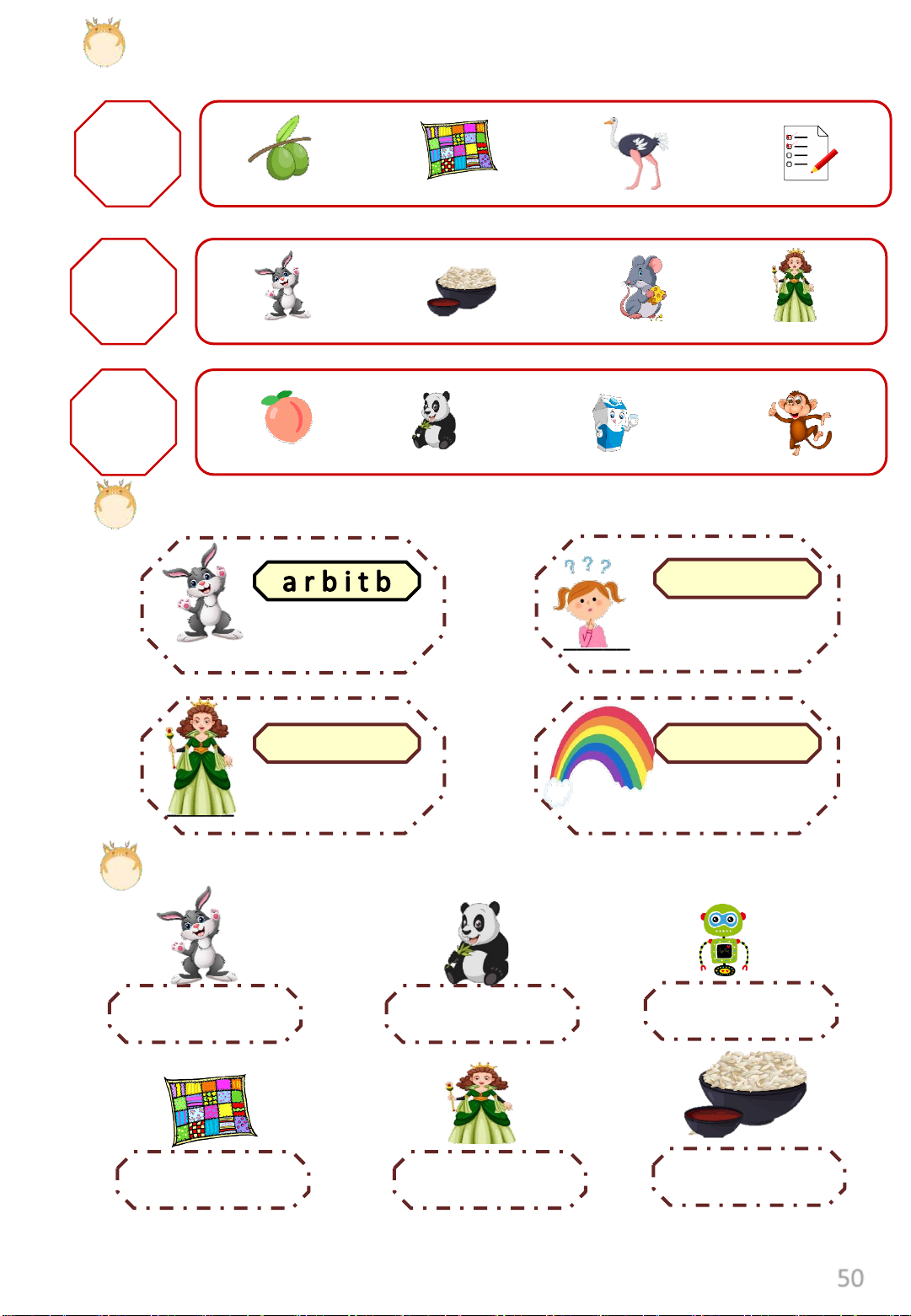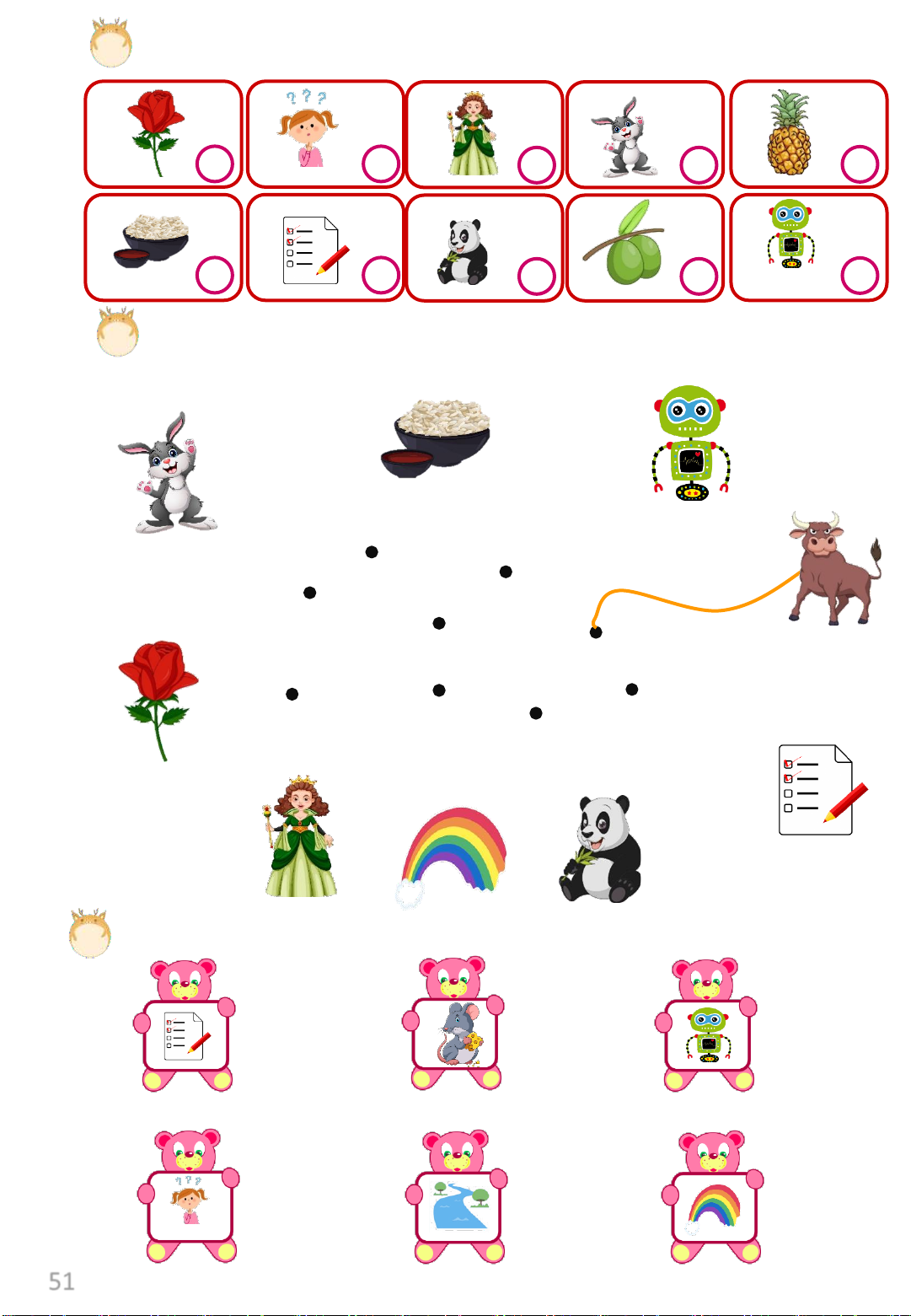 Exercise 5: Look and circle the correct sound. Rr Oo Rr Pp Rr Mm Qq Dd Qq Re Ee Rr 50 Exercise 6: Listen and number Exercise 7: Look and match rainbow robot rice rose ox rabbit queen quiz panda Exercise 8: Look and write. ________________ ________________ _______________ _ ________________ ________________ ________________ 51 LESSON 4: Numbers