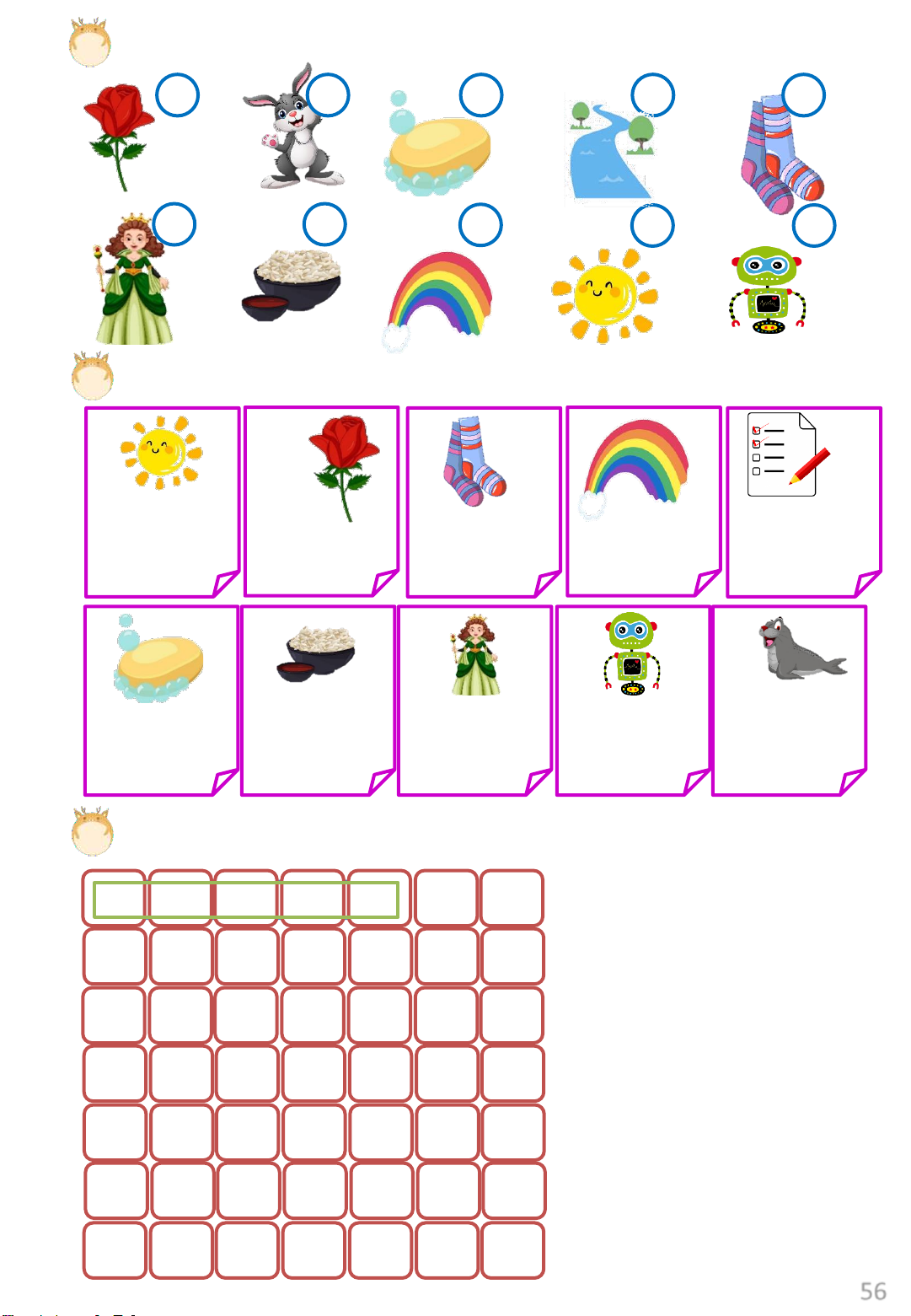 Exercise 2: Listen and put a tick or a cross. Ss Ss Rr 1 2 3 Tt Ee Rr 4 5 6 Qq Pp Uu 7 8 9 55 Exercise 4: Listen and number. Exercise 5: Look and circle. sun rose rose rainbow quiz quilt quilt socks seal seal sun rice rose robot queen soap quilt queen seal seal