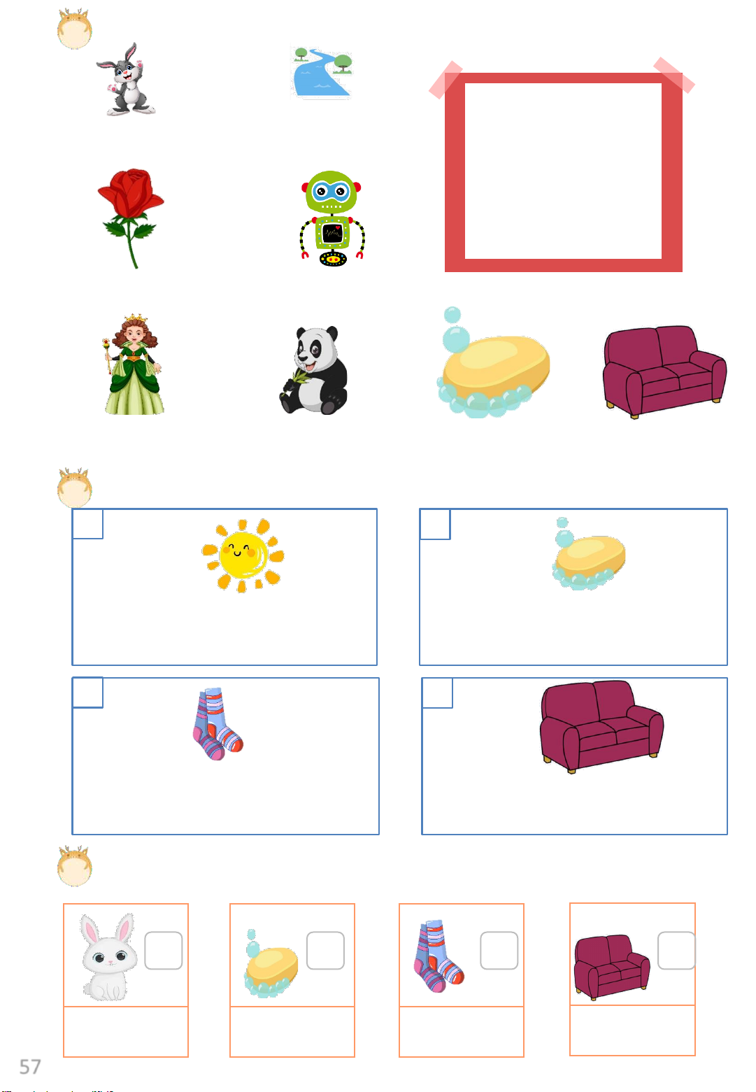 Exercise 9: Look and tick or cross rabbit soap sofa sun 57 LESSON 6: Story Exercise 1: Listen and write.