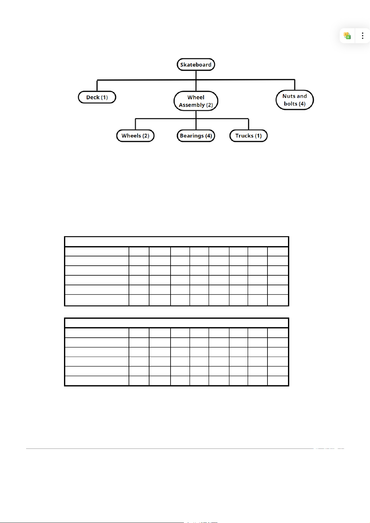 wheels, 15 trucks, and 30 nuts and bolts. When should it order parts? Solution: Level 0 - Skateboard (L=1) Week 1 2 3 4 5 6 7 8 Gross requirement 10 35 Opening stock 5 5 5 5 5 5 5 Net requirement 5 35 Start assembly 5 35 Scheduled completion 5 35 Level 1 - Deck (L=2) Week 1 2 3 4 5 6 7 8 Gross requirement 5 35 Opening stock Net requirement 5 35 Start order 5 35 Scheduled completion 5 35 Level 1 - Wheel Assembly (L=1) Week 1 2 3 4 5 6 7 8 Gross requirement 10 70 Opening stock Net requirement 10 70 Start assembly 10 70 Scheduled completion 10 70 Level 2 - Wheels (L=3) Week 1 2 3 4 5 6 7 8 Gross requirement 20 140 Opening stock 25 25 25 25 25 5 Net requirement 135 Start order 135 Scheduled completion 135 Level 2 - Bearings (L=2) Week 1 2 3 4 5 6 7 8 Gross requirement 40 280 Opening stock Net requirement 40 280 Start order 40 280 Scheduled completion 40 280 Level 2 - Trucks (L=4) Week 1 2 3 4 5 6 7 8 Gross requirement 10 70 Opening stock 15 15 15 15 15 5 Net requirement 65 Start order 65 Scheduled completion 65 Level 1 - Nuts and Bolts (L=4) Week 1 2 3 4 5 6 7 8 Gross requirement 20 140 Opening stock 30 30 30 30 30 30 10 Net requirement 130 Start order 130 Scheduled completion 130