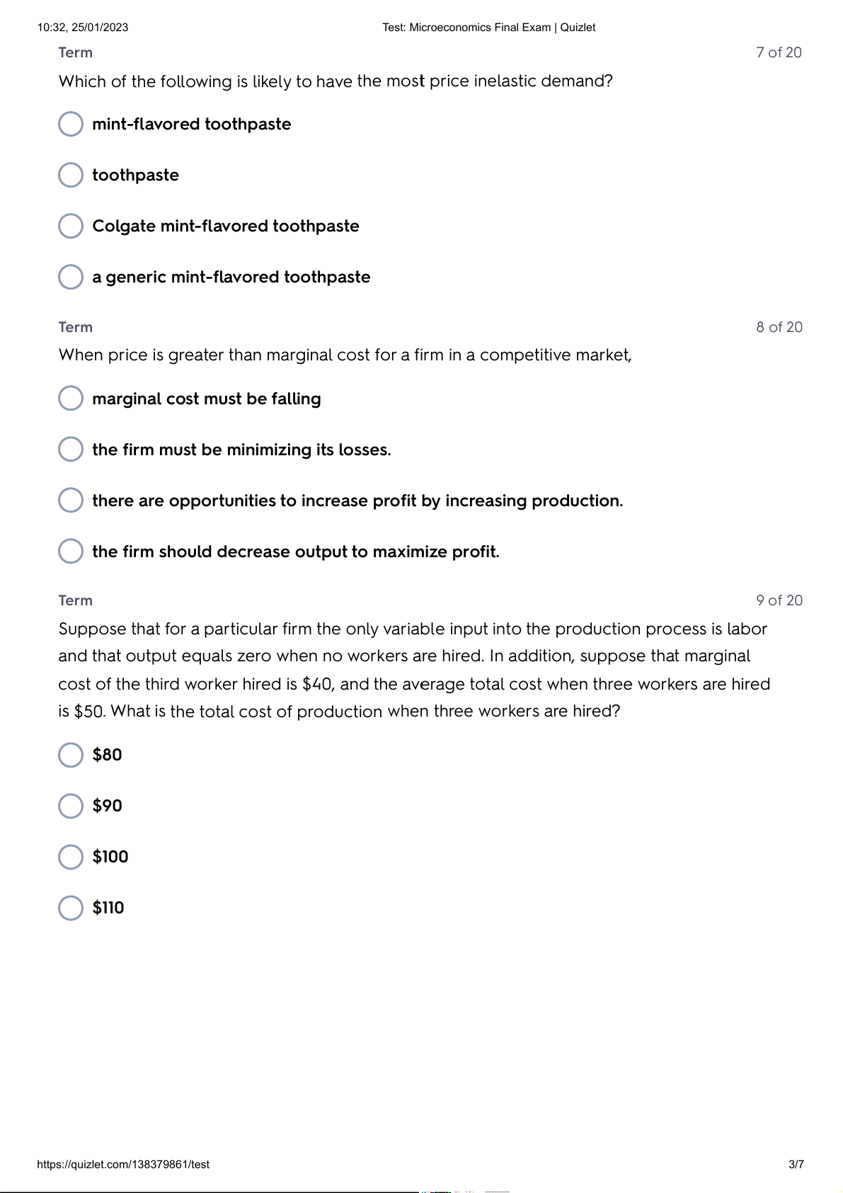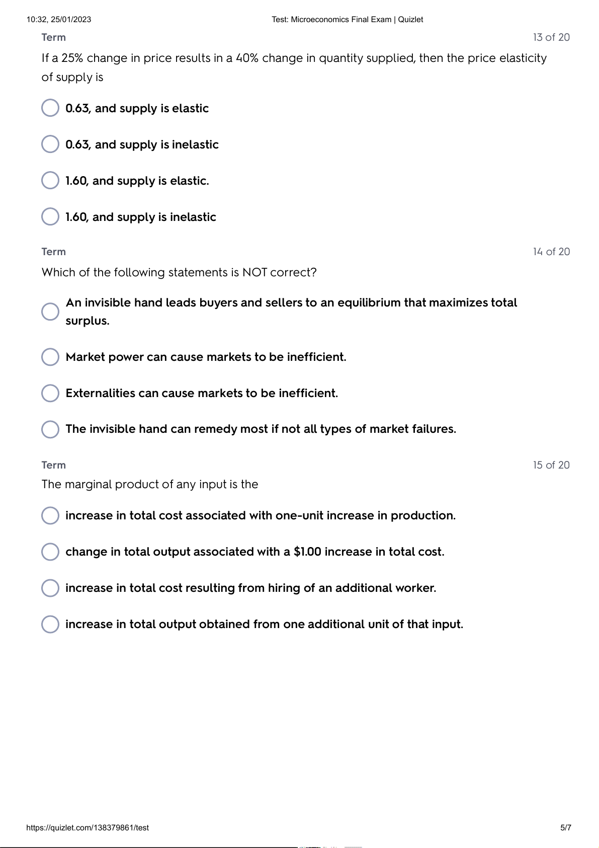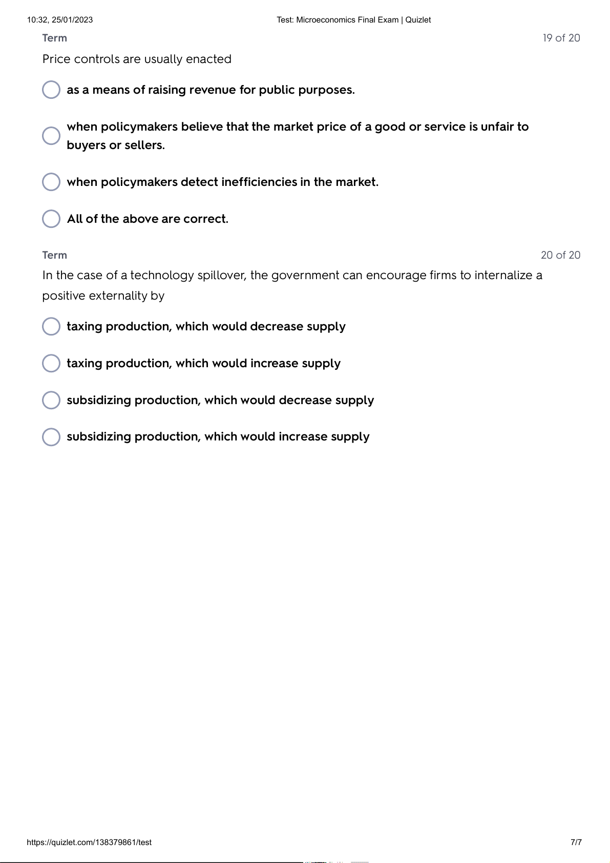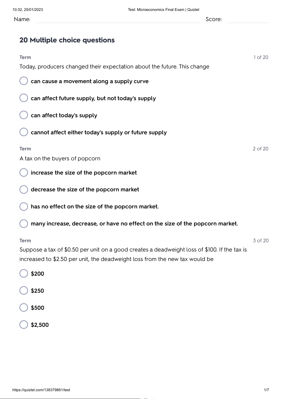 Test: Microeconomics Final Exam | Quizlet Name: Score: 20 Multiple choice questions Term 1 of 20