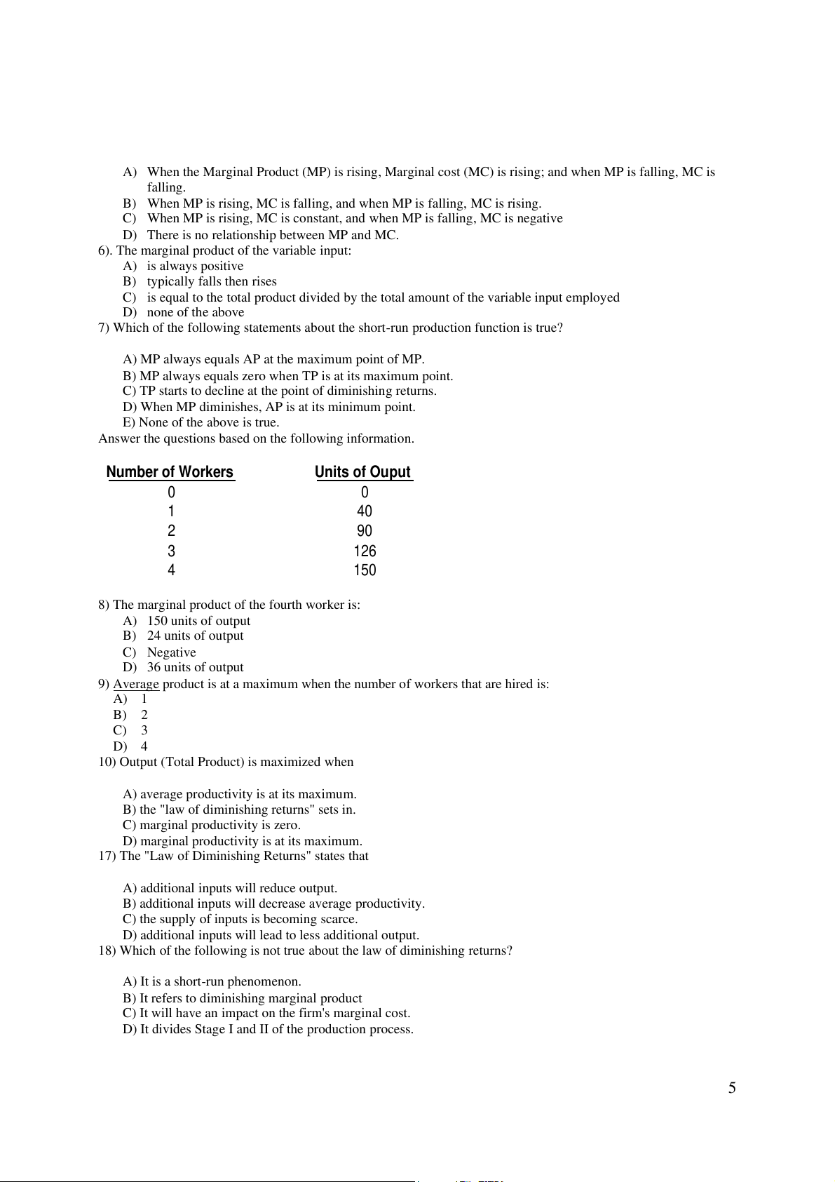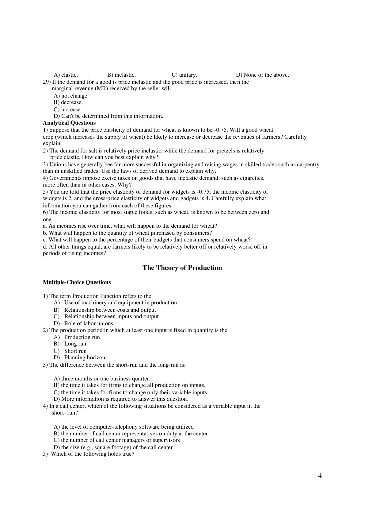 5) If the demand for a product is said to be relatively inelastic, the “absolute” value of the elasticity coefficient will be: A) Less than one B) Greater than one 1 C) Equal to one D) Zero