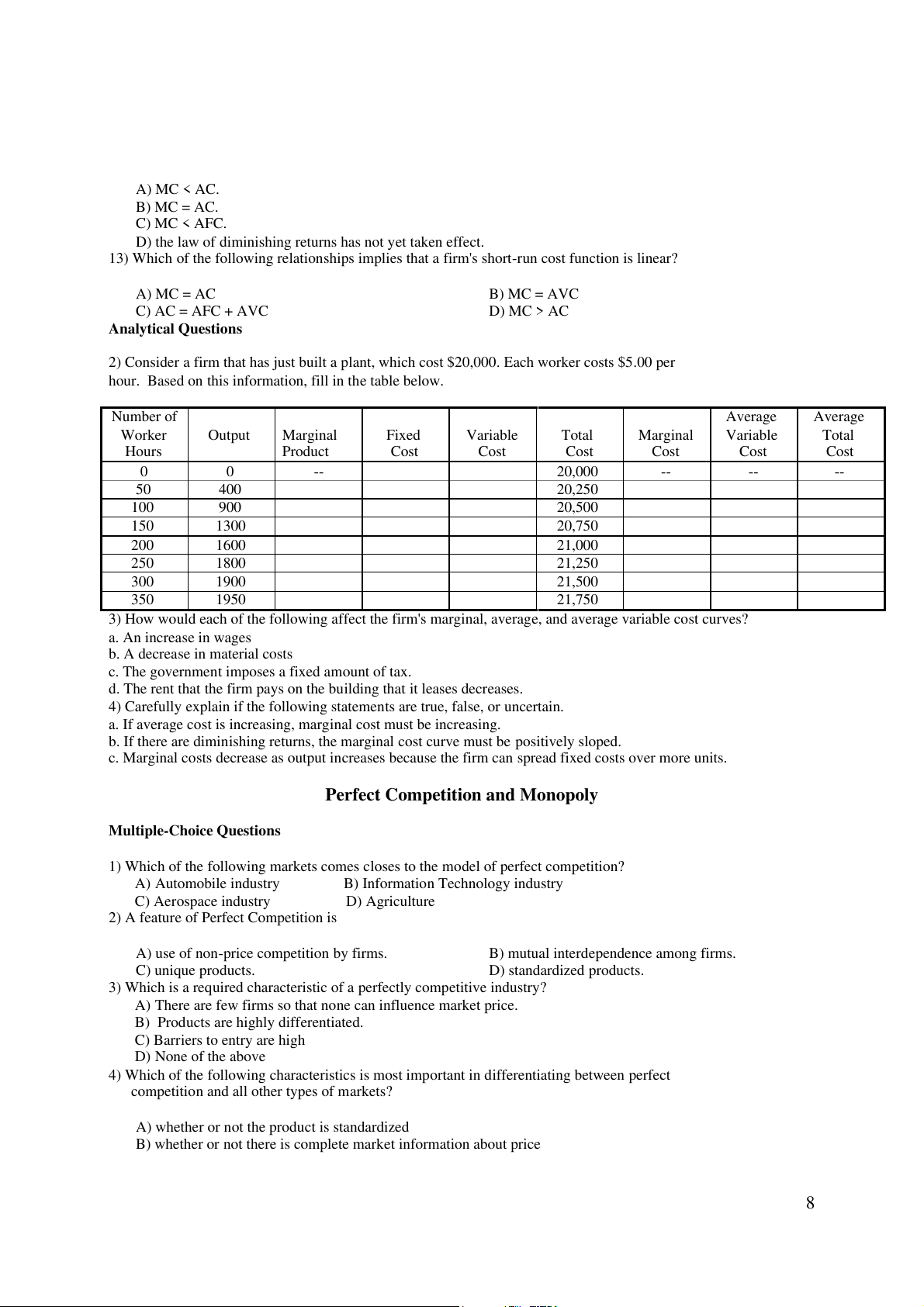 9) Which of the following conditions would definitely cause a perfectly competitive company to shut down in the short run? A) P < MC B) P = MC < AC C) P < AVC D) P = MR