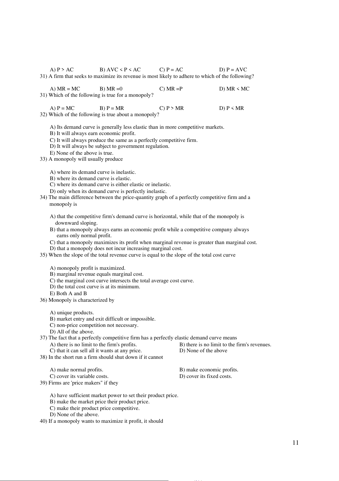 31) Which of the following is true for a monopoly? A) P = MC B) P = MR C) P > MR D) P < MR