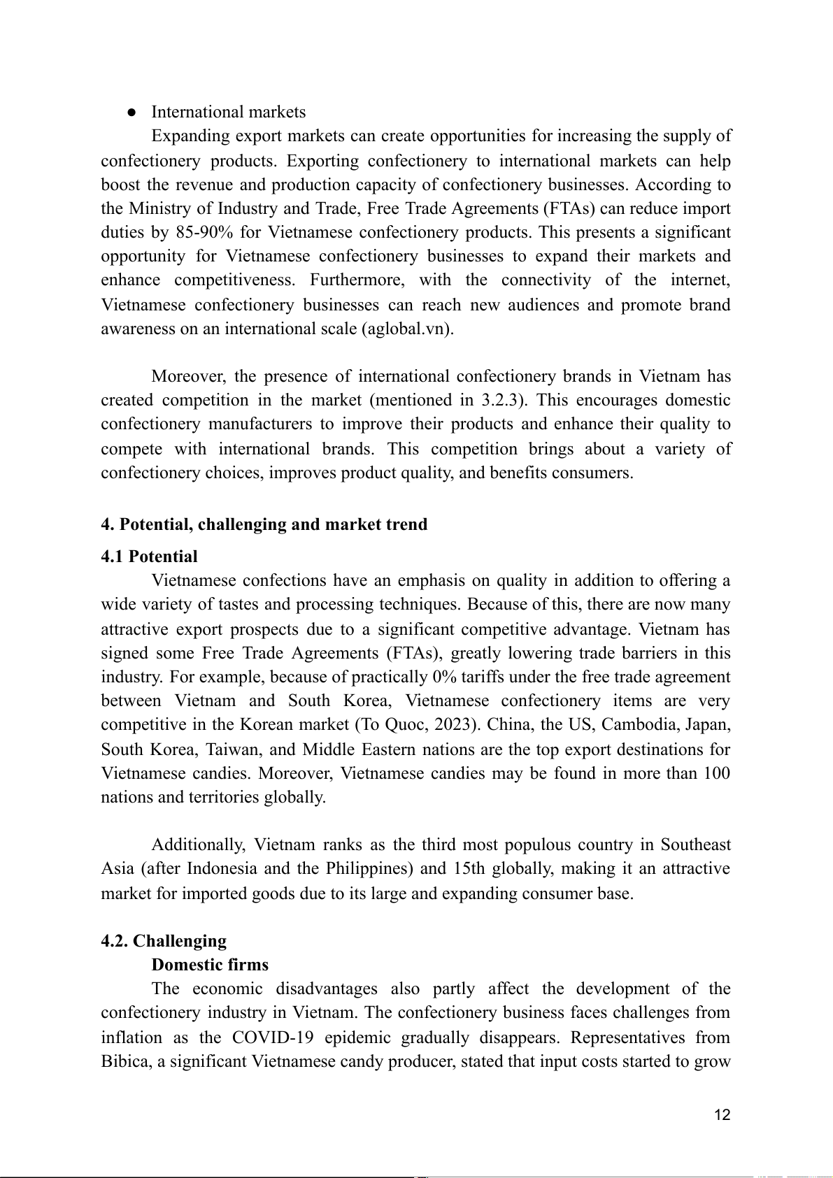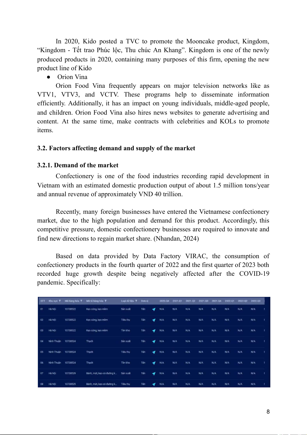 many foreign confectionery import companies operating in the Vietnamese confectionery market (Vietdata, 2023). This suggests a dynamic and competitive industry, with a mix of local and international firms meeting Vietnam's expanding demand for confectionery products. In Viet Nam, opportunities can be very
