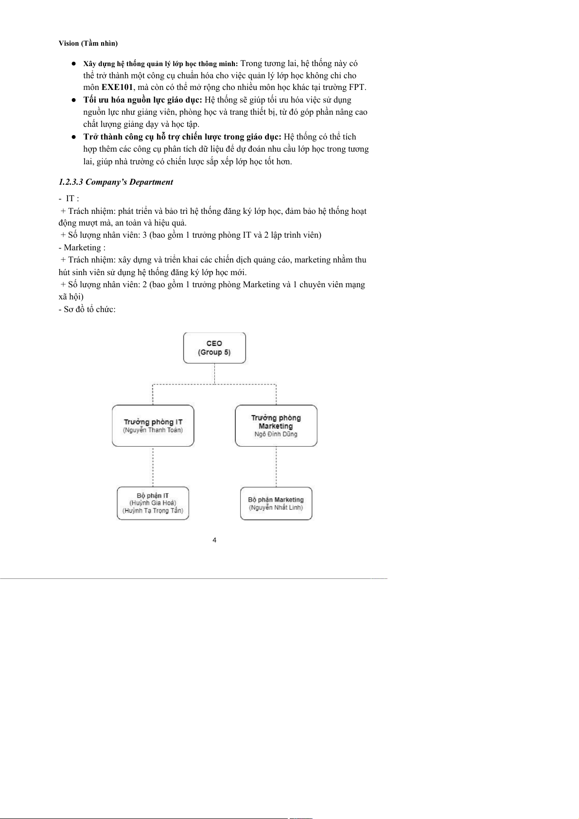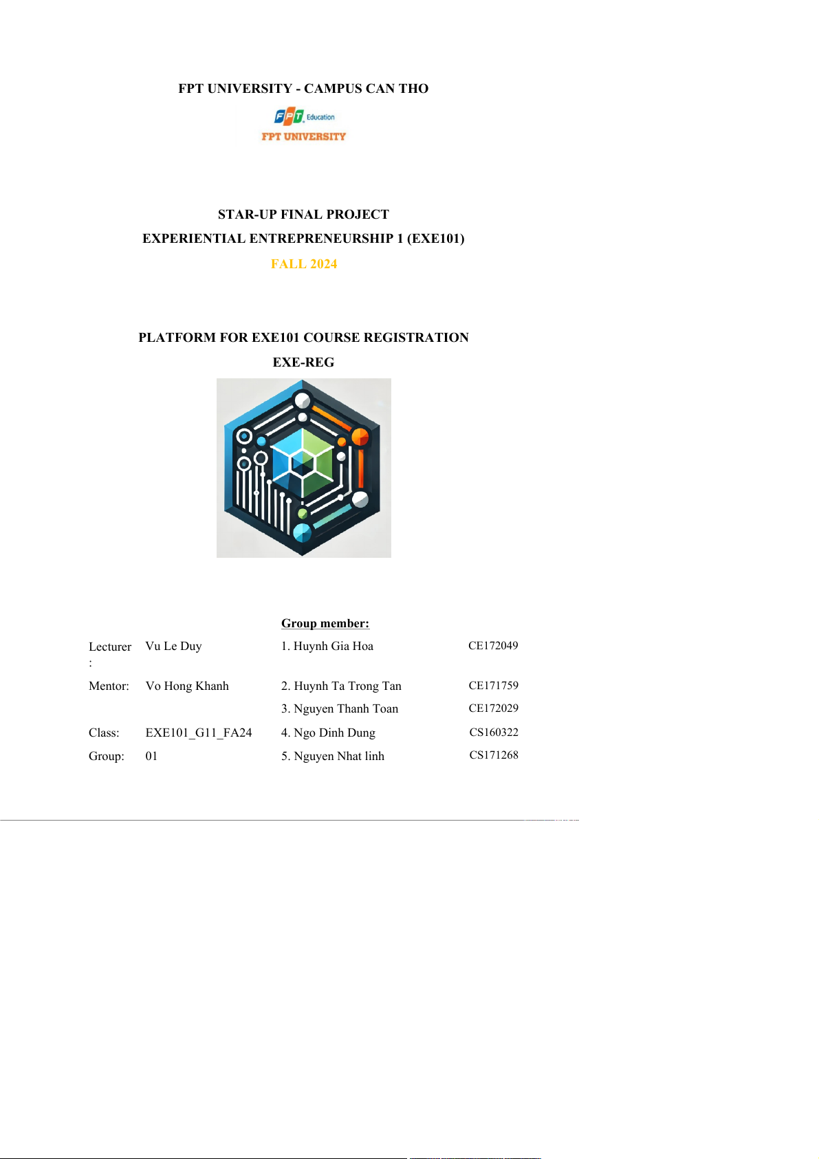 PLATFORM FOR EXE101 COURSE REGISTRATION EXE-REG Group member: Lecturer Vu Le Duy 1. Huynh Gia Hoa CE172049 : Mentor: Vo Hong Khanh 2. Huynh Ta Trong Tan CE171759 3. Nguyen Thanh Toan CE172029 Class: EXE101_G11_FA24 4. Ngo Dinh Dung CS160322 Group: 01 5. Nguyen Nhat linh CS171268 Can Tho, 07/2024 TABLE OF CONTENTS