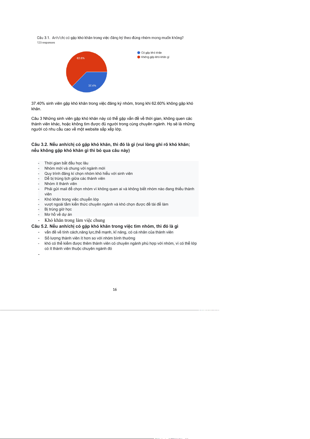 37.40% sinh viên gặp khó khăn trong việc đăng ký nhóm, trong khi 62.60% không gặp khó khăn.
