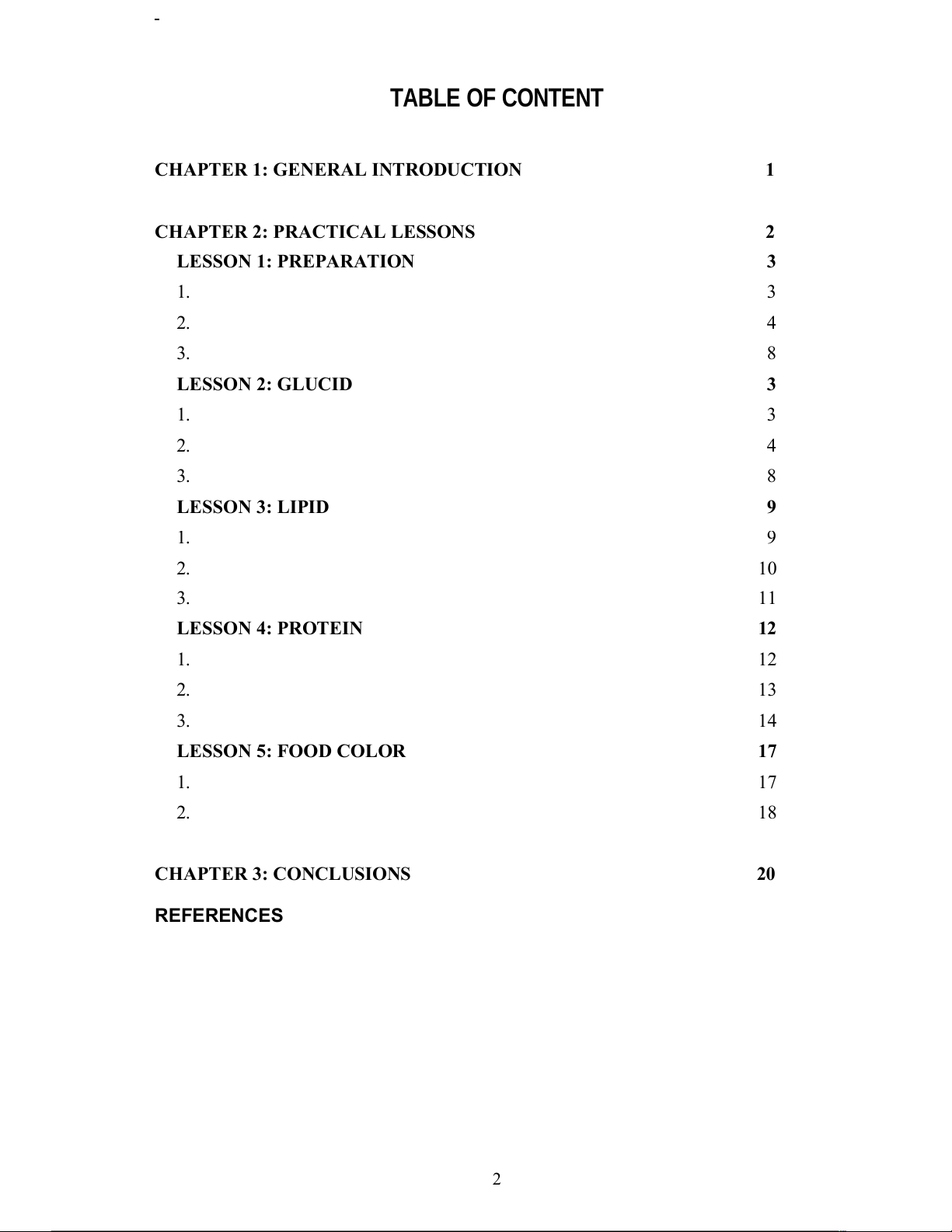 CHAPTER 2: PRACTICAL LESSONS 2 LESSON 1: PREPARATION 3 1. 3 2. 4 3. 8 LESSON 2: GLUCID 3 1. 3 2. 4 3. 8 LESSON 3: LIPID 9 1. 9 2. 10 3. 11 LESSON 4: PROTEIN 12 1. 12 2. 13 3. 14 LESSON 5: FOOD COLOR 17 1. 17 2. 18 CHAPTER 3: CONCLUSIONS 20 REFERENCES 2 Lab Reports