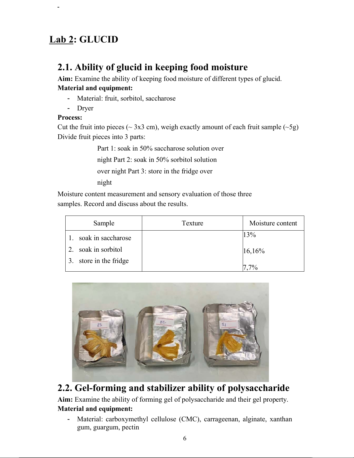 samples. Record and discuss about the results. Sample Texture Moisture content 13% 1. soak in saccharose 2. soak in sorbitol 16,16% 3. store in the fridge 7,7%