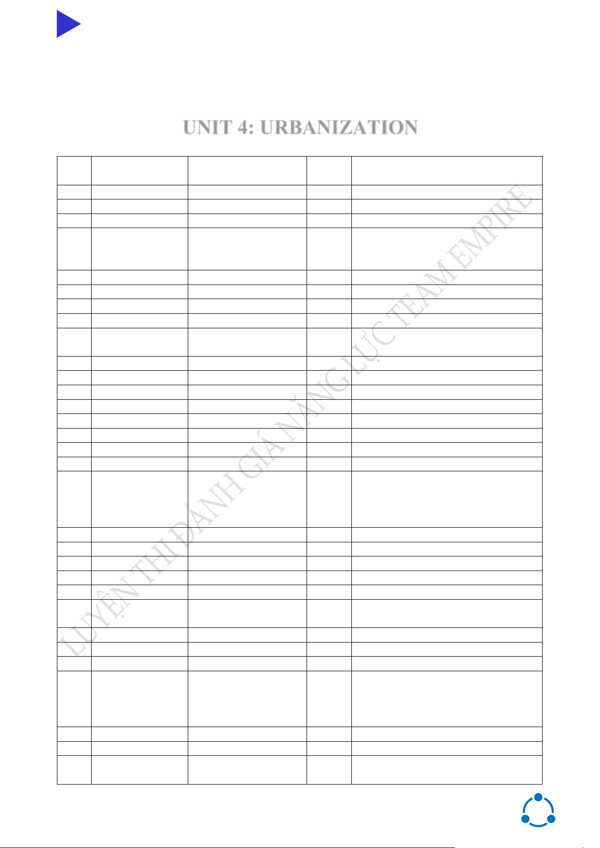 LUYỆN THI ĐÁNH GIÁ NĂNG LỰC - TEAM EMPIRE I. VOCABULARY STT TỪ VỰNG PHIÊN ÂM TỪ NGHĨA LOẠI 1 Endangered /ɪnˈdeɪndʒəd/ adj có nguy cơ tuyệt chủng Dangerous /ˈdeɪndʒərəs/ adj nguy hiểm Danger /ˈdeɪndʒər/ n sự nguy hiểm Endanger /ɪnˈdeɪndʒər/ v gây nguy hiểm 2 Primate /ˈpraɪmeɪt/ n linh trưởng 3 Enclose /ɪnˈkləʊz/ v rào quanh Enclosure /ɪnˈkləʊʒər/ n