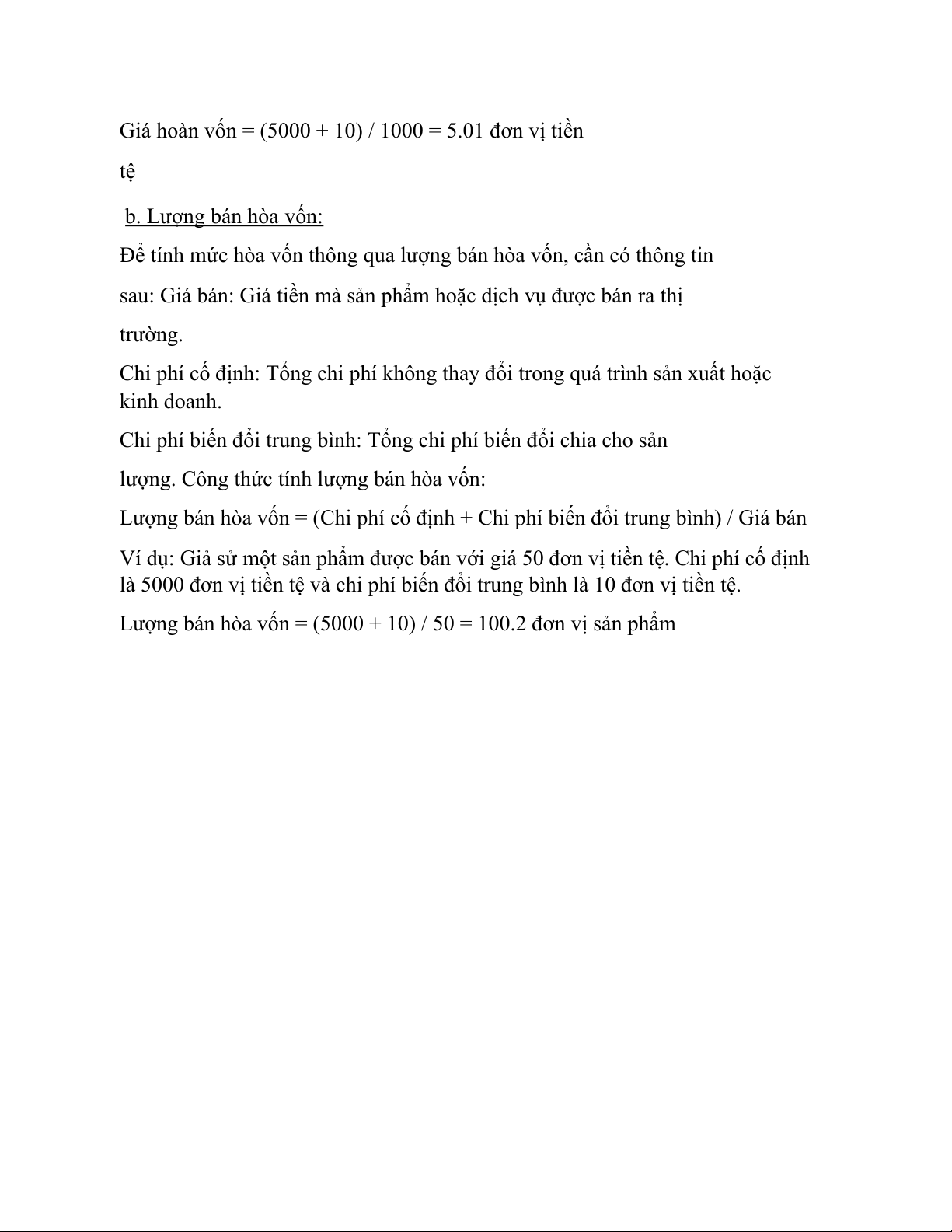 Giá hoàn vốn = (5000 + 10) / 1000 = 5.01 đơn vị tiền tệ b. Lượng bán hòa vốn: