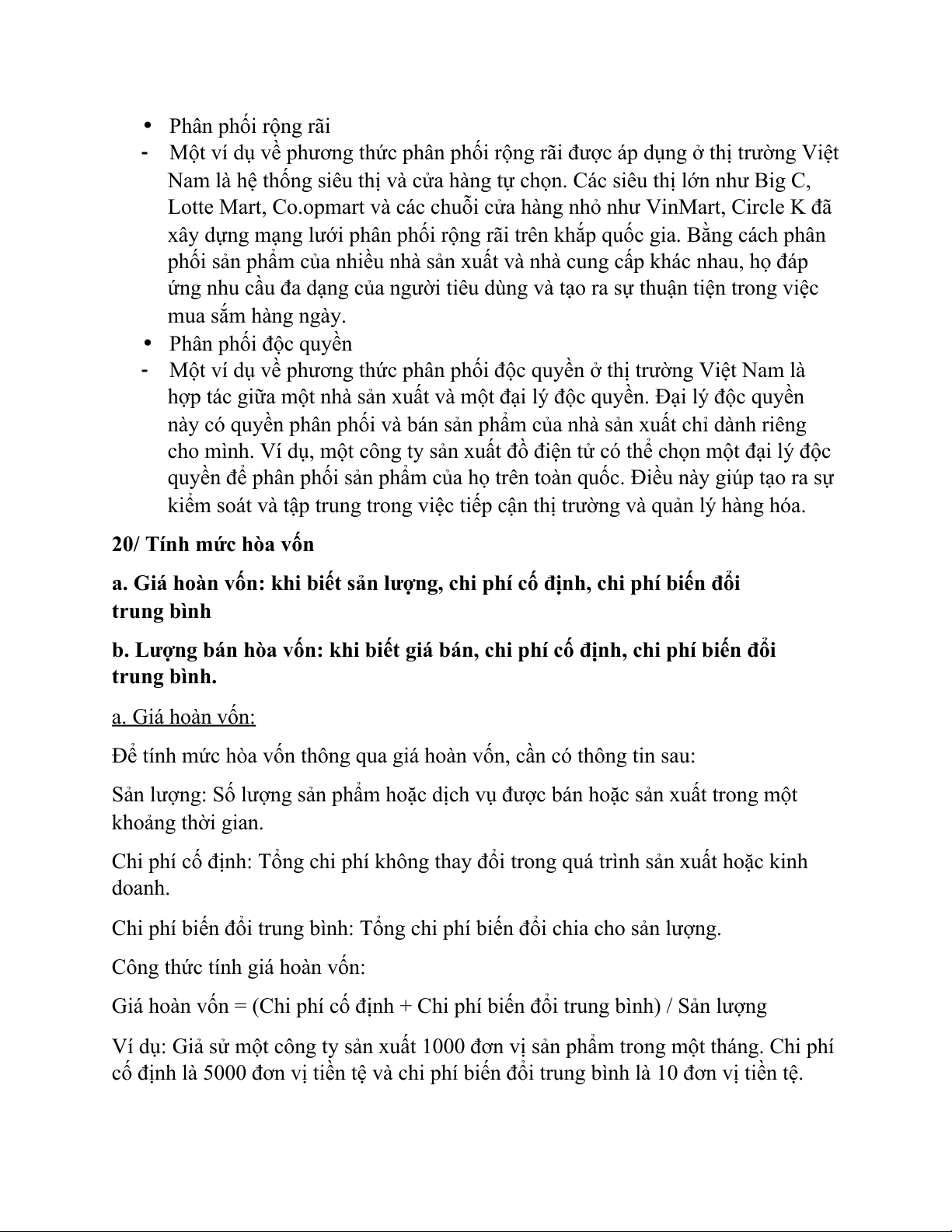 a. Giá hoàn vốn: khi biết sản lượng, chi phí cố định, chi phí biến đổi trung bình