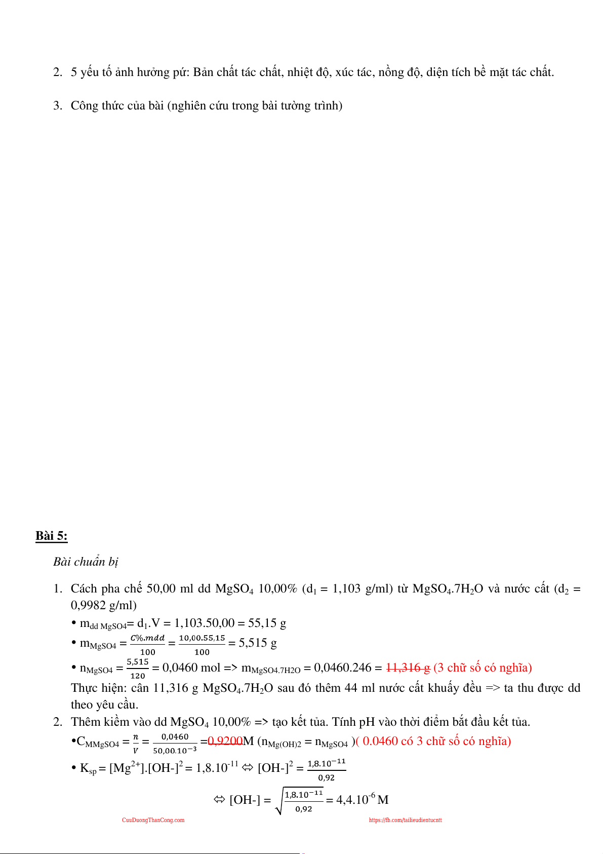 1. Cách pha chế 50,00 ml dd MgSO4 10,00% (d1 = 1,103 g/ml) từ MgSO4.7H2O và nước cất (d2 = 0,9982 g/ml)