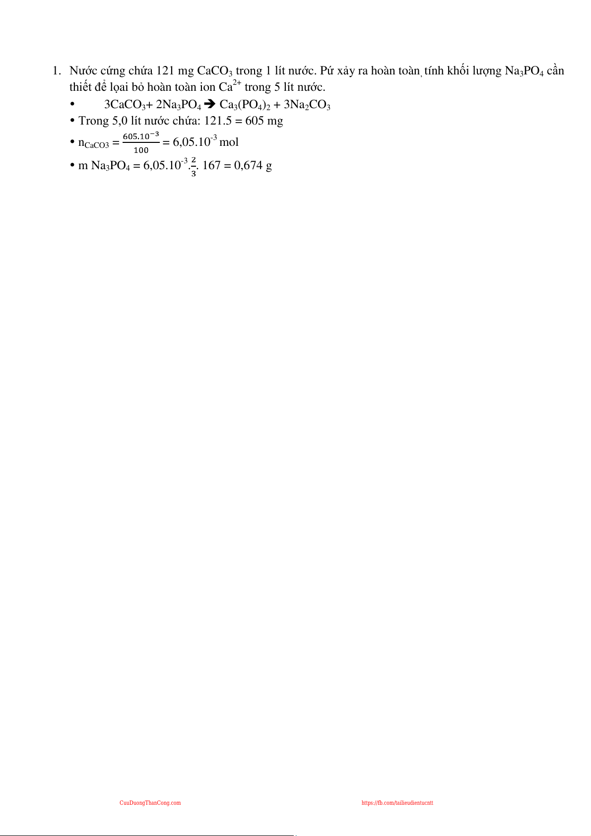 1. Nước cứng chứa 121 mg CaCO3 trong 1 lít nước. Pứ xảy ra hoàn toàn, tính khối lượng Na3PO4 cần
