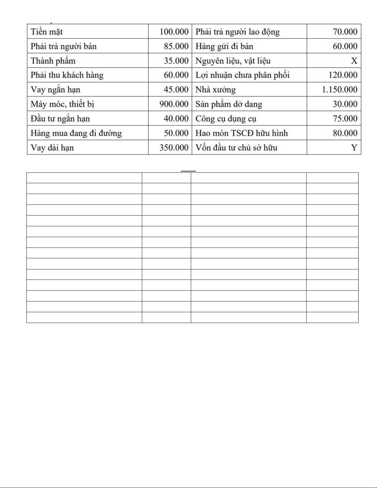 Phải trả người lao động 70.000 Thành phẩm 35.000 Vay ngắn hạn 45.000 Nguyên liệu, vật liệu X Vay dài han 350.000 Phải thu khách hàng 60.000