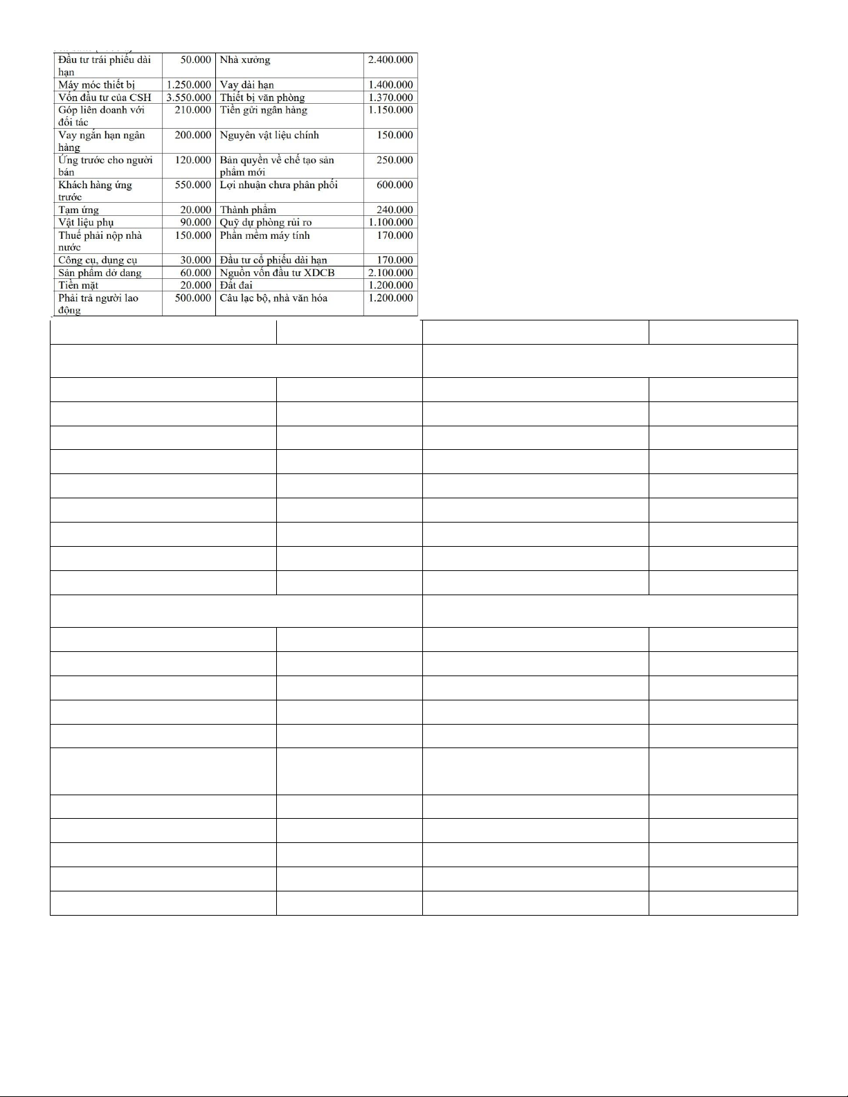 Đầu tư trái phiếu dài hạn 50.000 Vốn đầu tư của CSH 3.550.000 Máy móc thiết bị 1.250.000