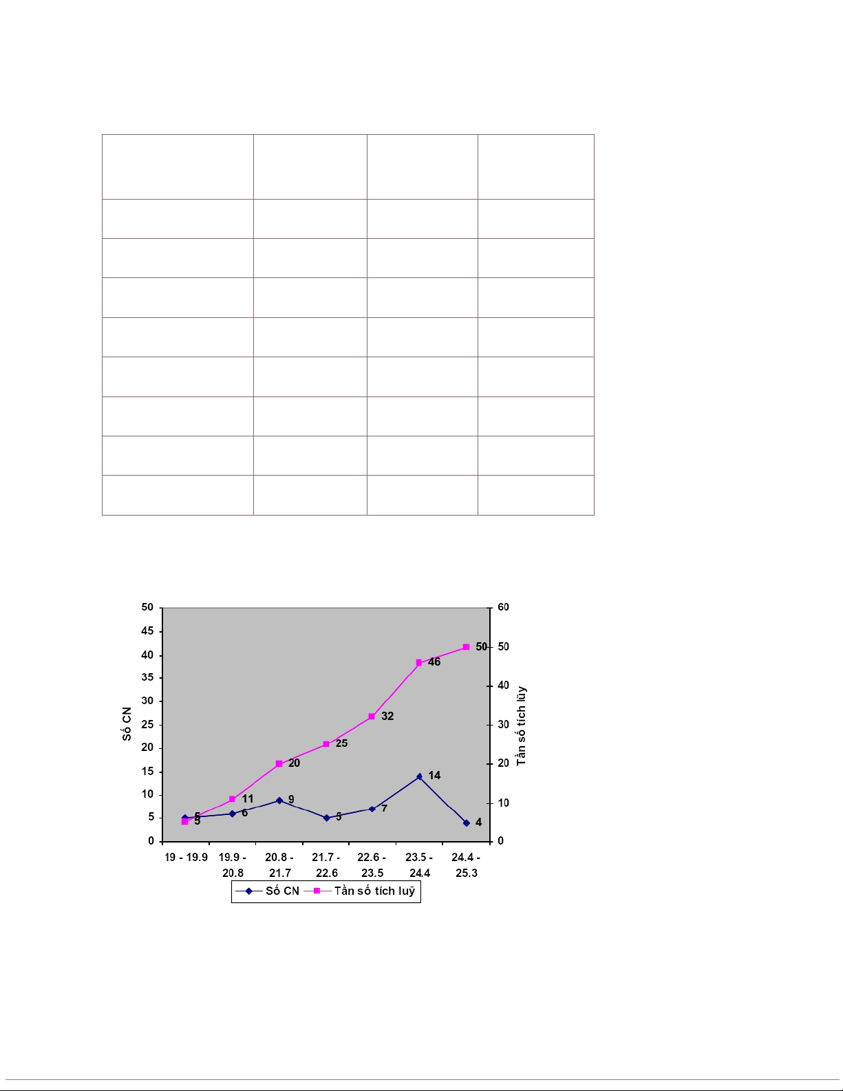 2. Biểu diễn kết quả lên đồ thị: Bài 2.2: Khoảng cách tổ: Ta có kết quả phân tổ: Số nhân viên Số cửa hàng 1-5 7 17.5 1.75 6-10 9 22.5 2.25 11-15 10 25 2.5 16-20 8 20 2 21-25 6 15 1.5 Tổng 40 100 Bài 2.3: Khoảng cách tổ: Kết quả phân tổ: Thời gian Số CN Tần suất Tần số tích luỹ 19 -19.9 5 0.1 5 19.9 - 20.8 6 0.12 11 20.8 - 21.7 9 0.18 20 21.7 - 22.6 5 0.1 25 22.6 - 23.5 7 0.14 32 23.5 - 24.4 14 0.28 46 24.4 - 25.3 4 0.08 50 Tổng 50 1
