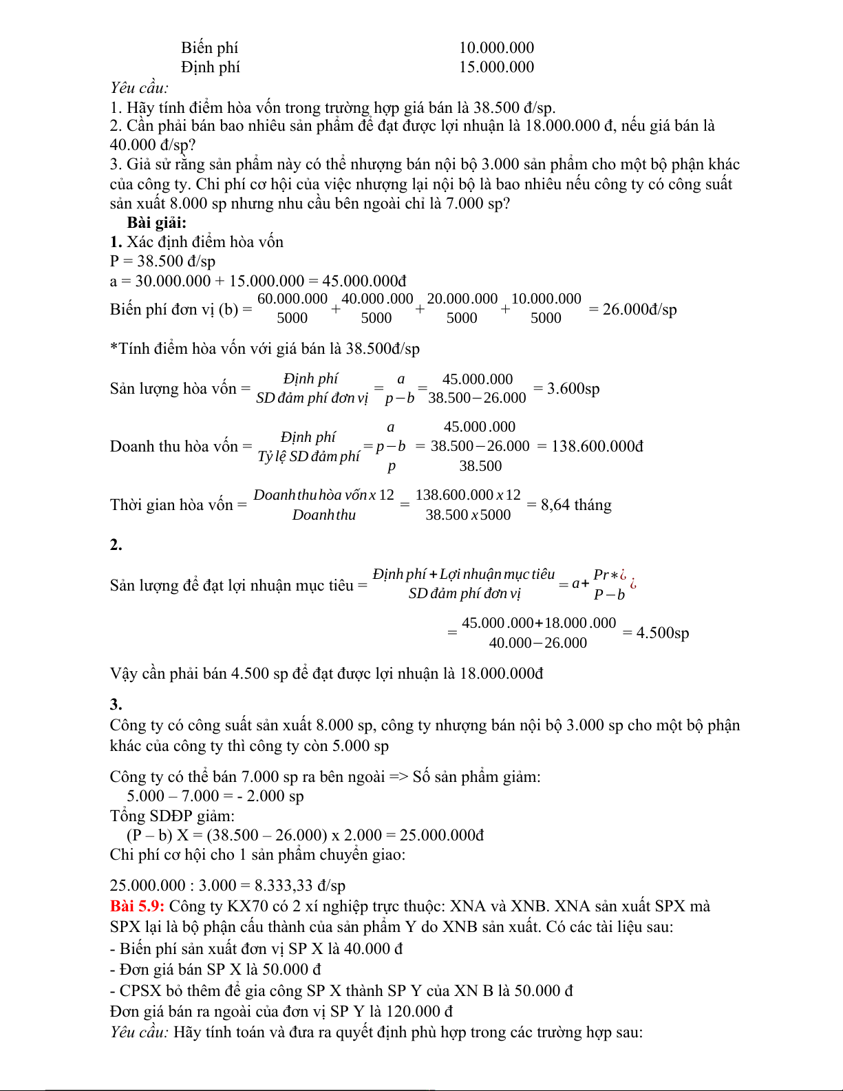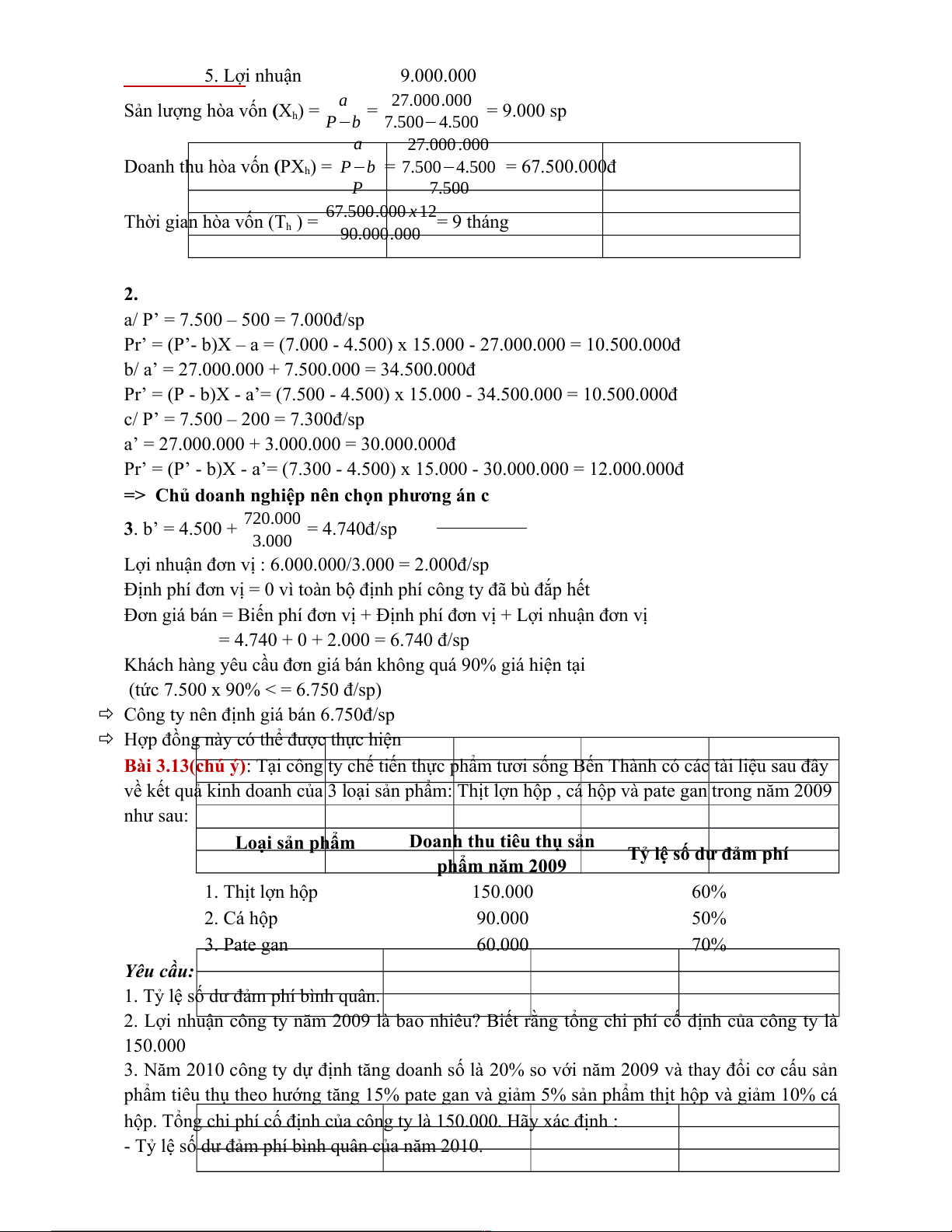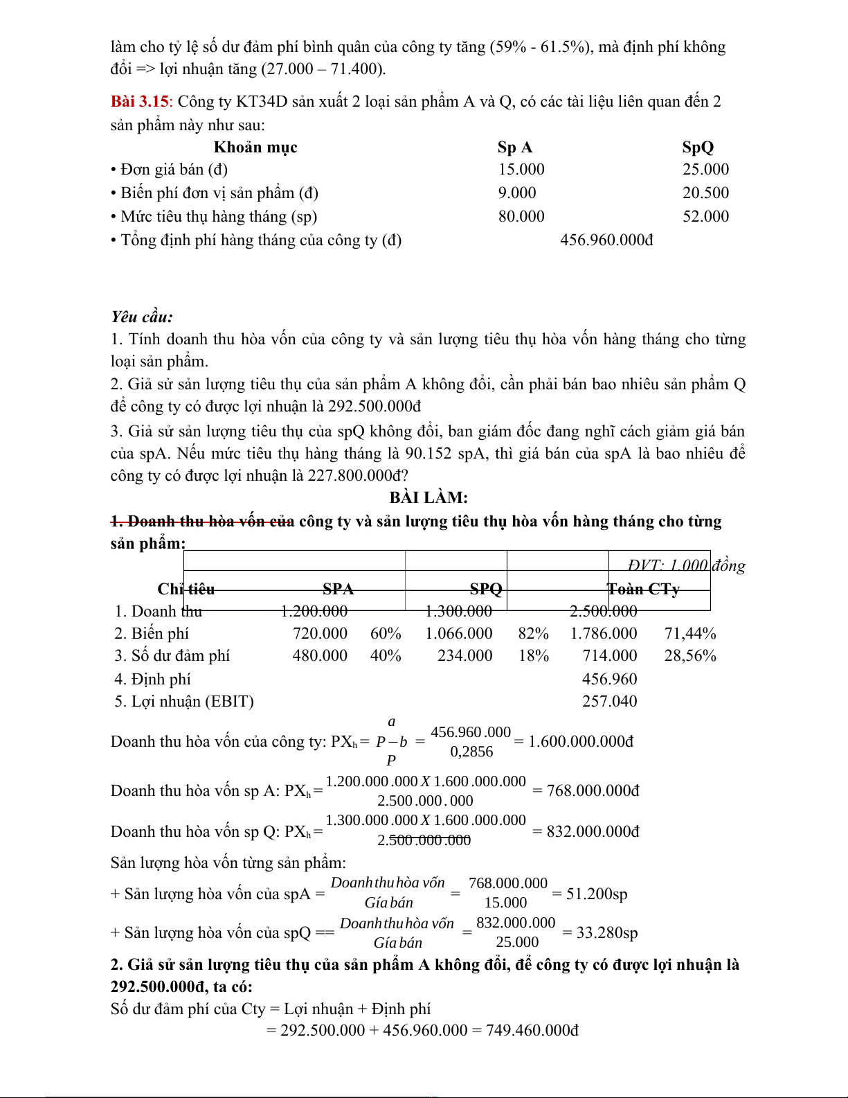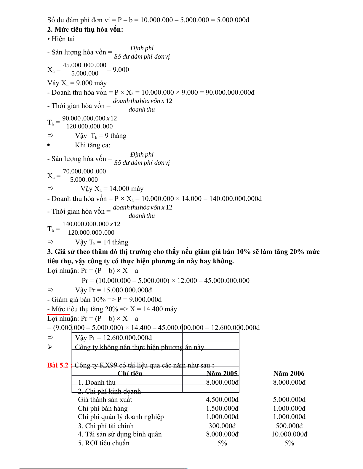 Doanh thu hòa vốn (P.Xh) = P−b = 15.000−9.000 = 240.000.000đ P 15.000