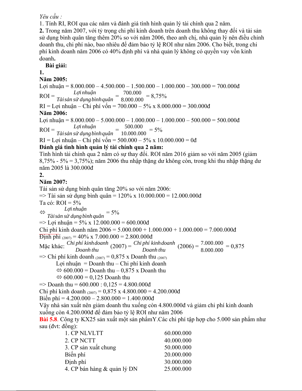4. Tài sản sử dụng bình quân 8.000.000đ 10.000.000đ 5. ROI tiêu chuẩn 5% 5% Yêu cầu :