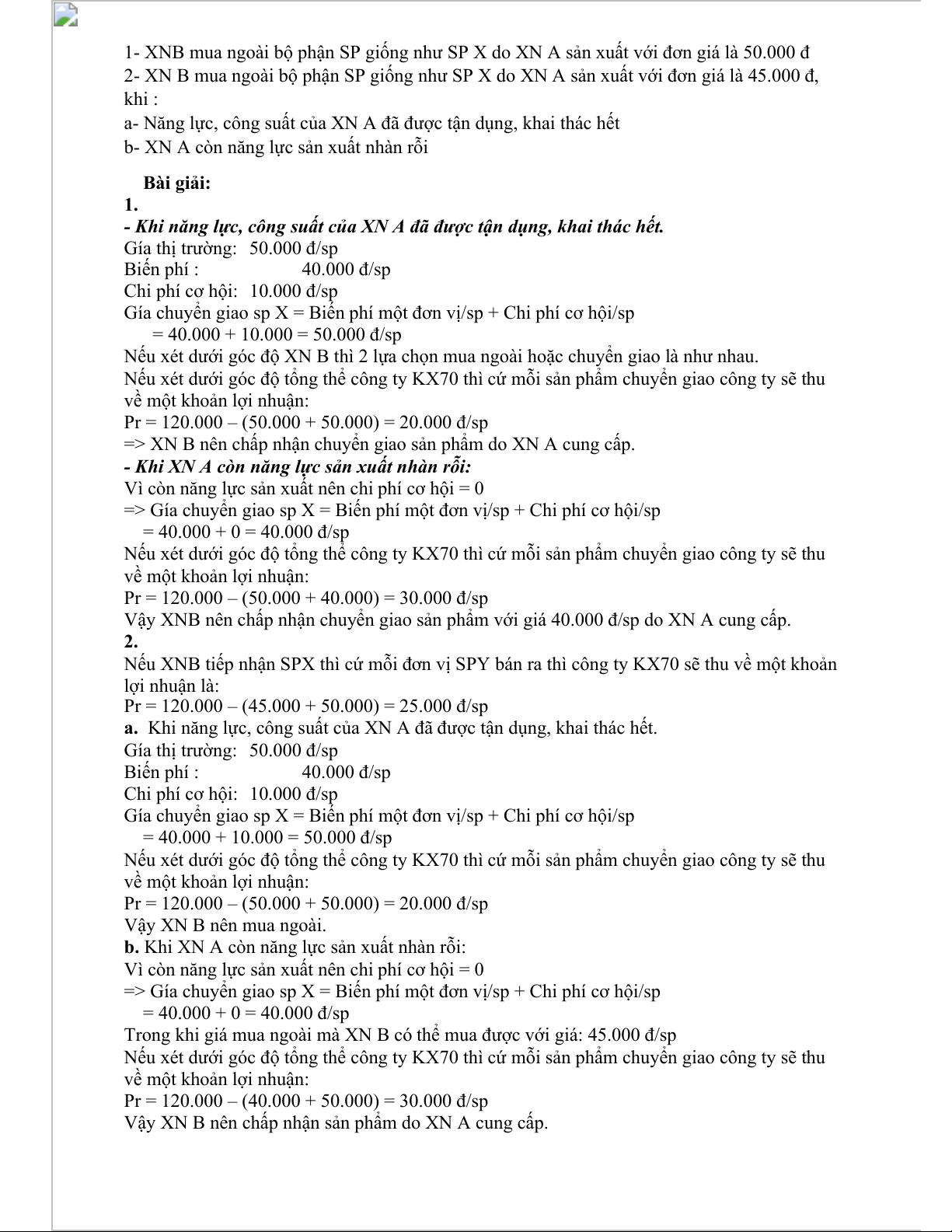 => Gía chuyển giao sp X = Biến phí một đơn vị/sp + Chi phí cơ hội/sp = 40.000 + 0 = 40.000 đ/sp