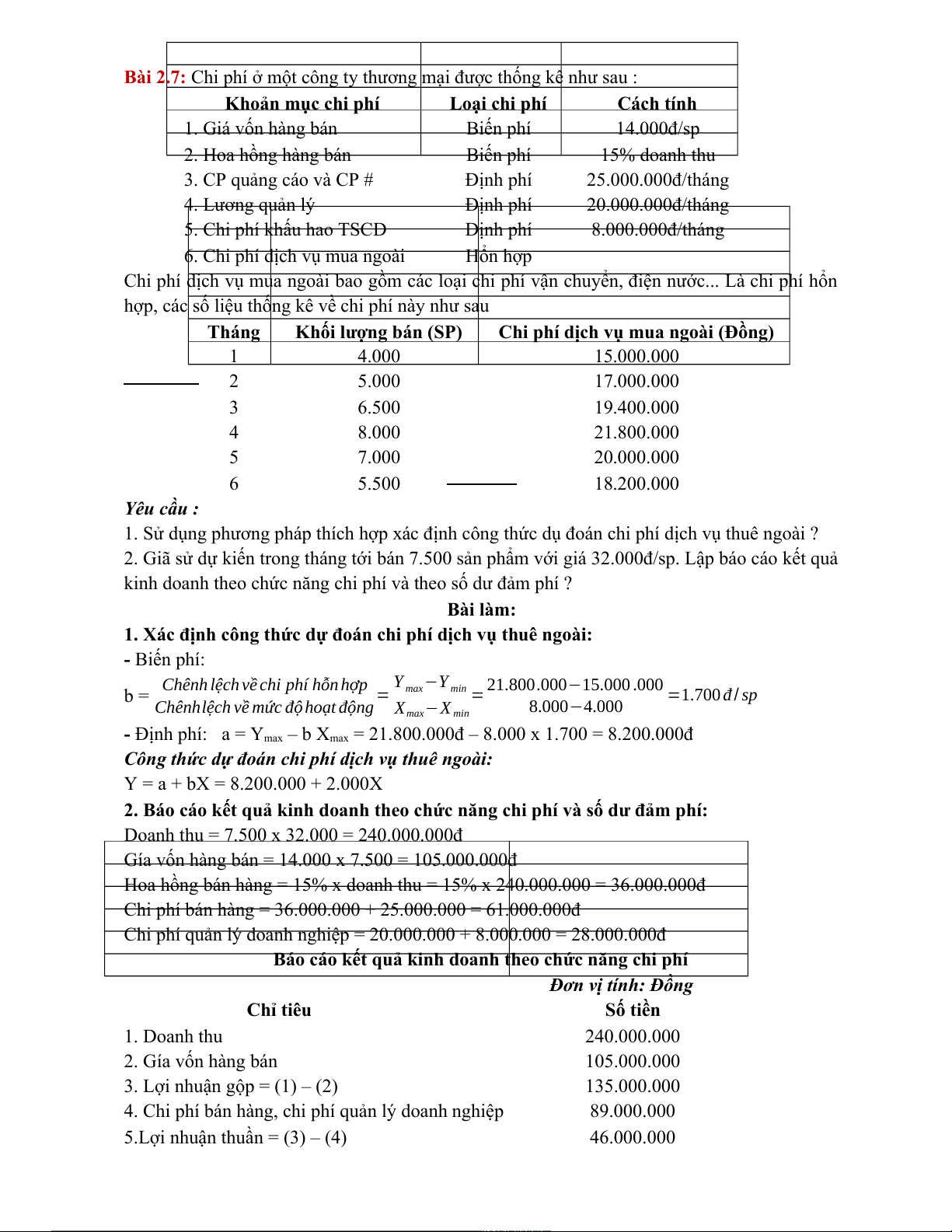 1. Xác định công thức dự đoán chi phí dịch vụ thuê ngoài: - Biến phí: Y −Y