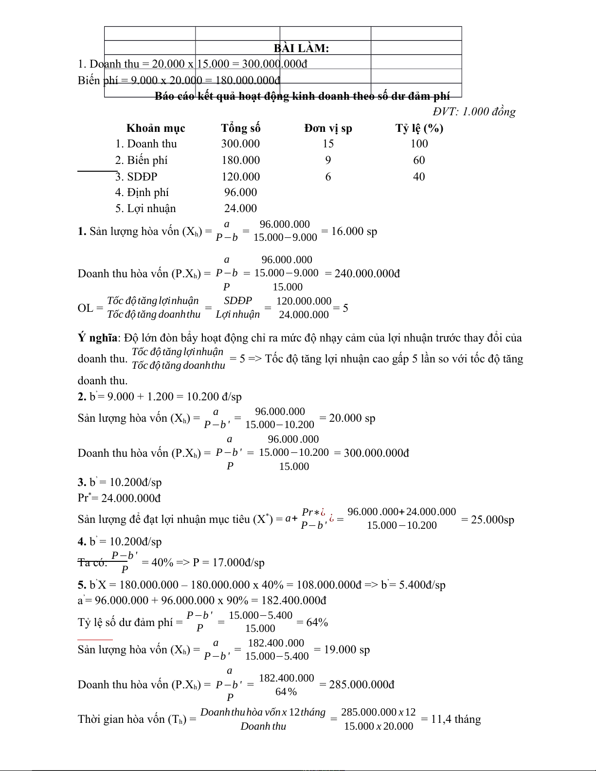 Báo cáo kết quả hoạt động kinh doanh theo số dư đảm phí ĐVT: 1.000 đồng Khoản mục Tổng số Đơn vị sp Tỷ lệ (%) 1. Doanh thu 300.000 15 100 2. Biến phí 180.000 9 60 3. SDĐP 120.000 6 40 4. Định phí 96.000 5. Lợi nhuận 24.000 a