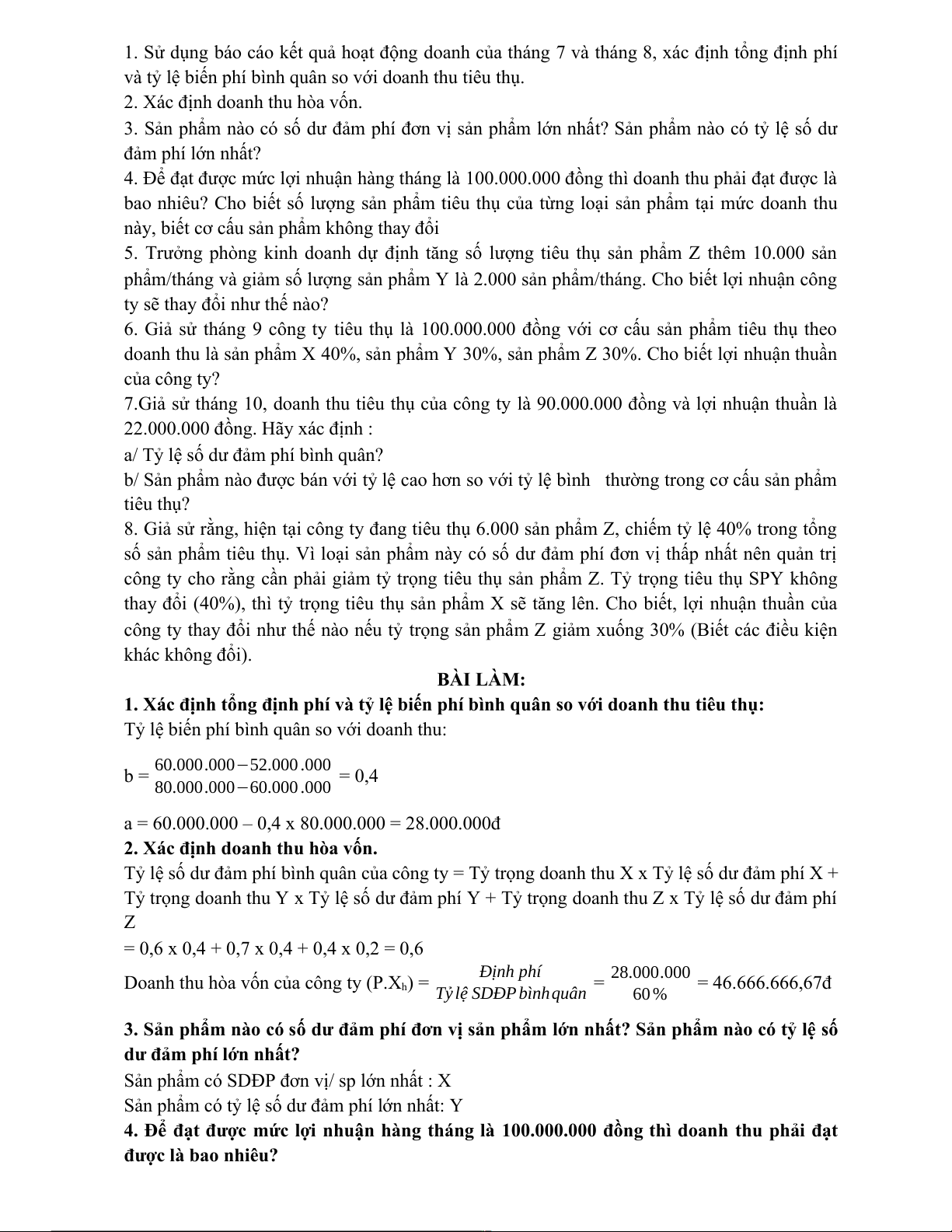 4. CP bán hàng & quản lý DN 25.000.000 Biến phí 10.000.000 Định phí 15.000.000 Yêu cầu: