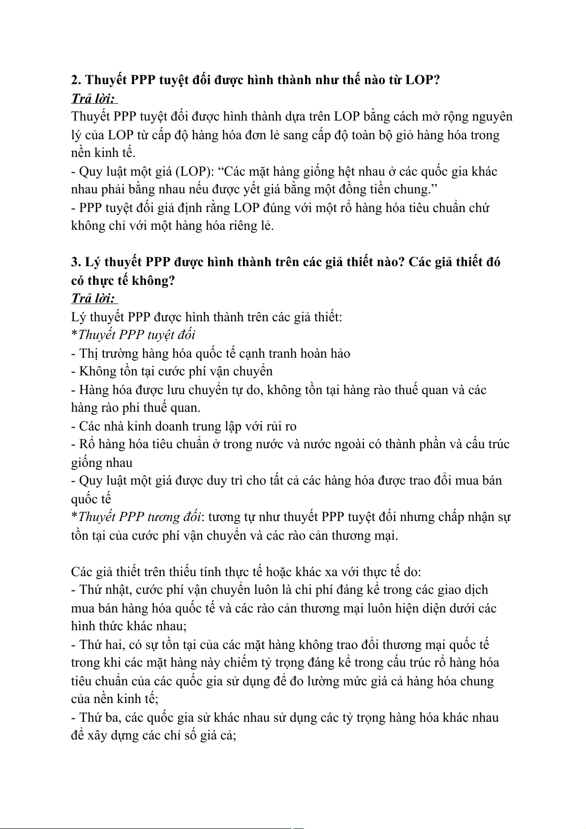 3. Lý thuyết PPP được hình thành trên các giả thiết nào? Các giả thiết đó có thực tế không? Trả lời: