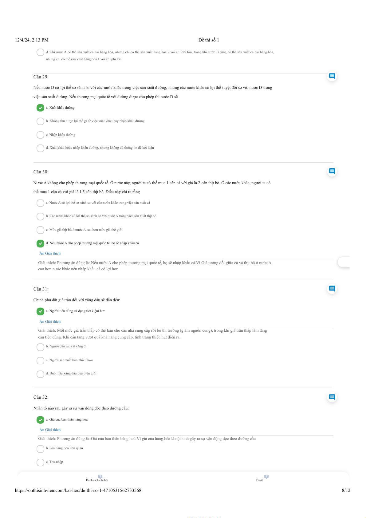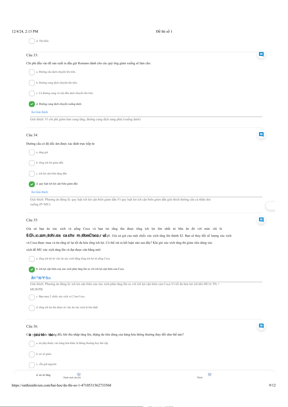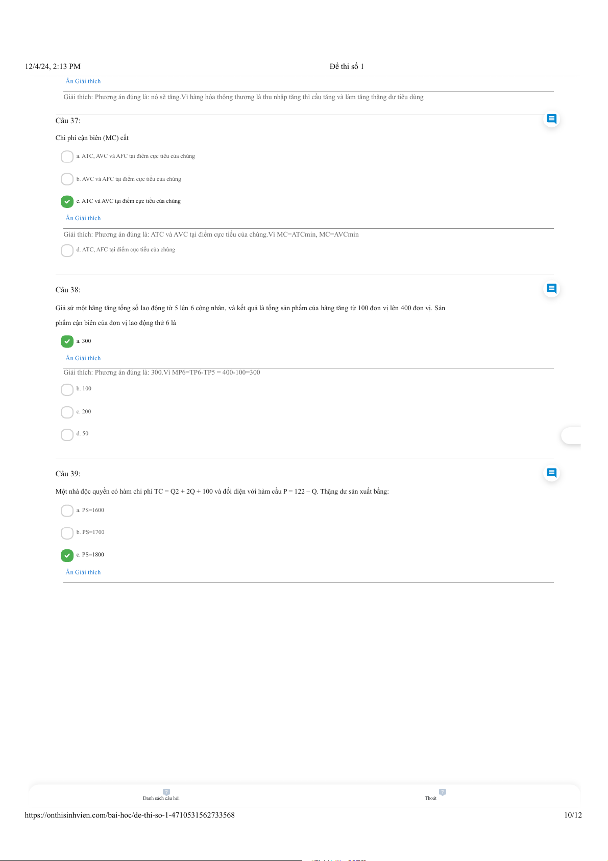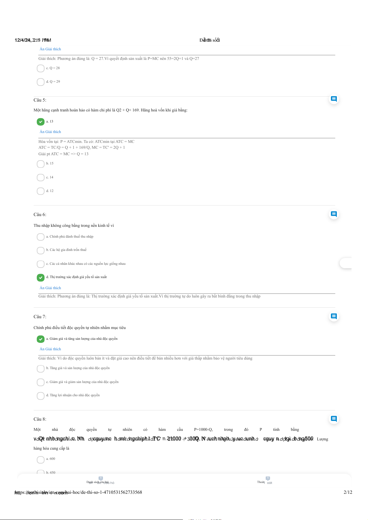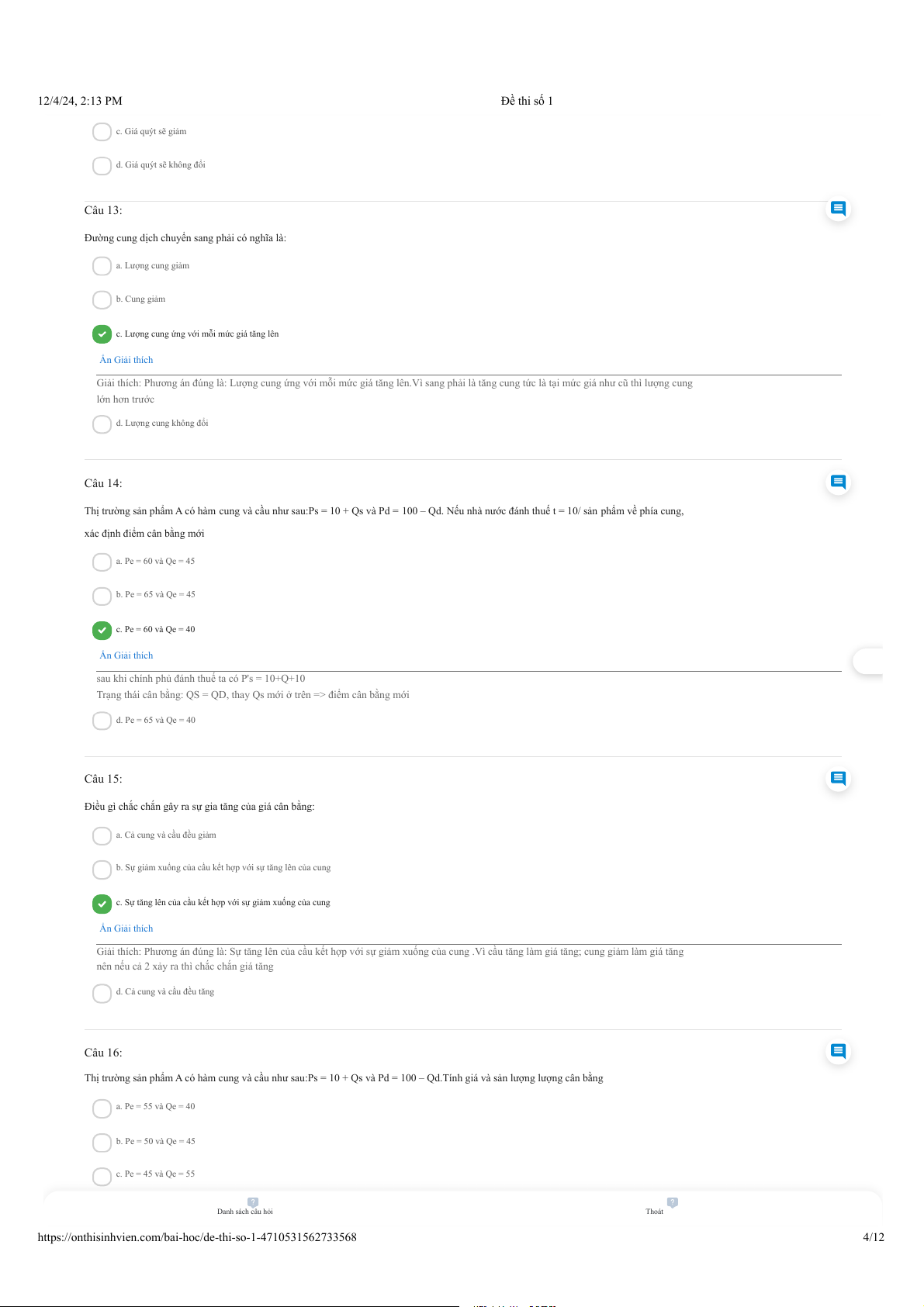 https://onthisinhvien.com/bai-hoc/de-thi-so-1-4710531562733568 4/12 12/4/24, 2:13 PM Đề thi số 1 d. Pe =55 và Qe = 45 Ẩn Giải thích