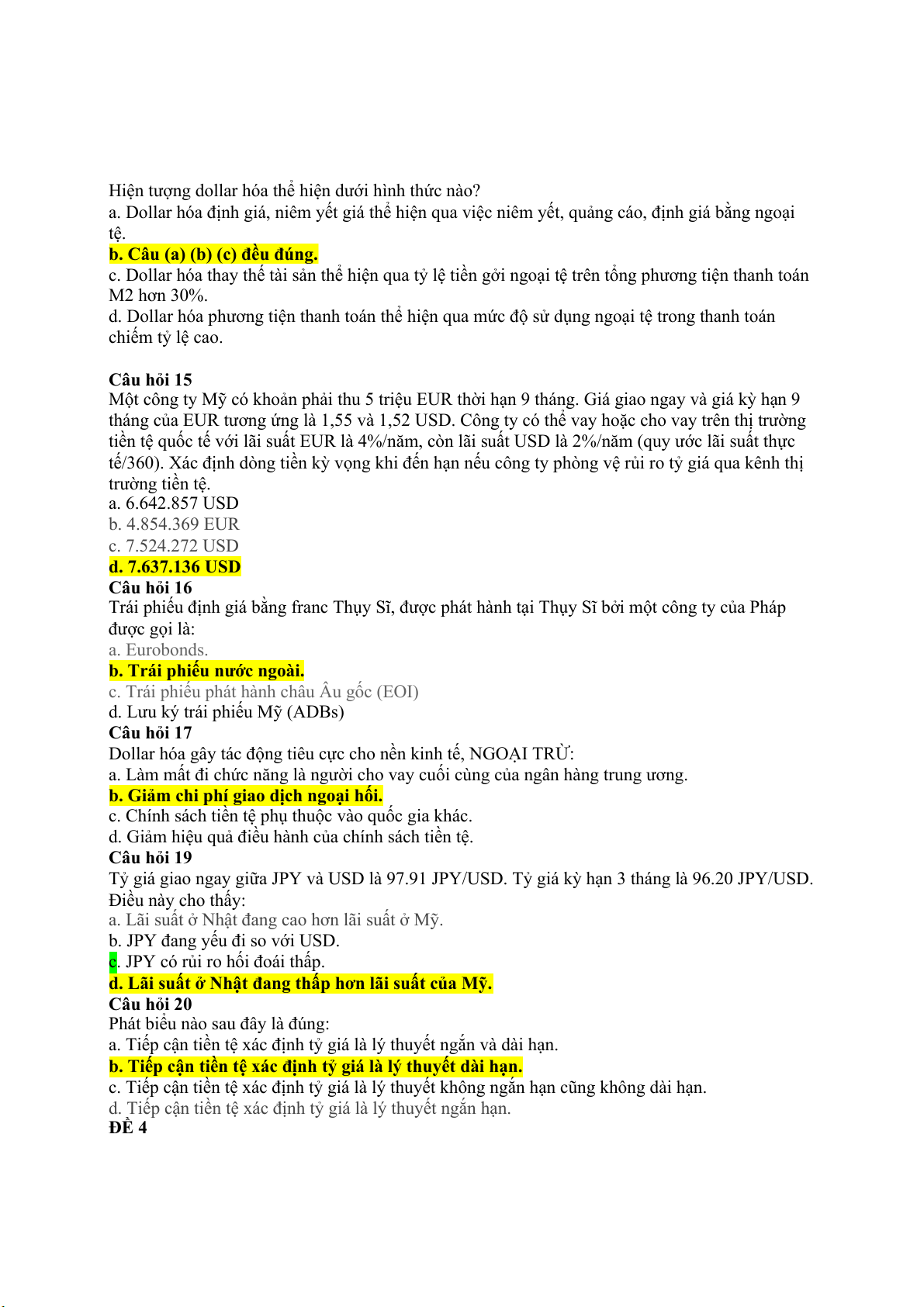 d. Cung USD tăng, EUR giảm giá. Câu hỏi 15