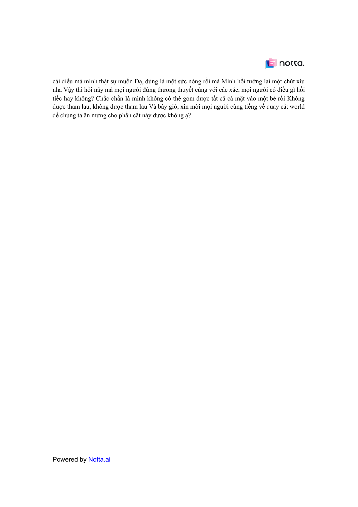 để chúng ta ăn mừng cho phần cắt này được không ạ? Powered by Notta.ai