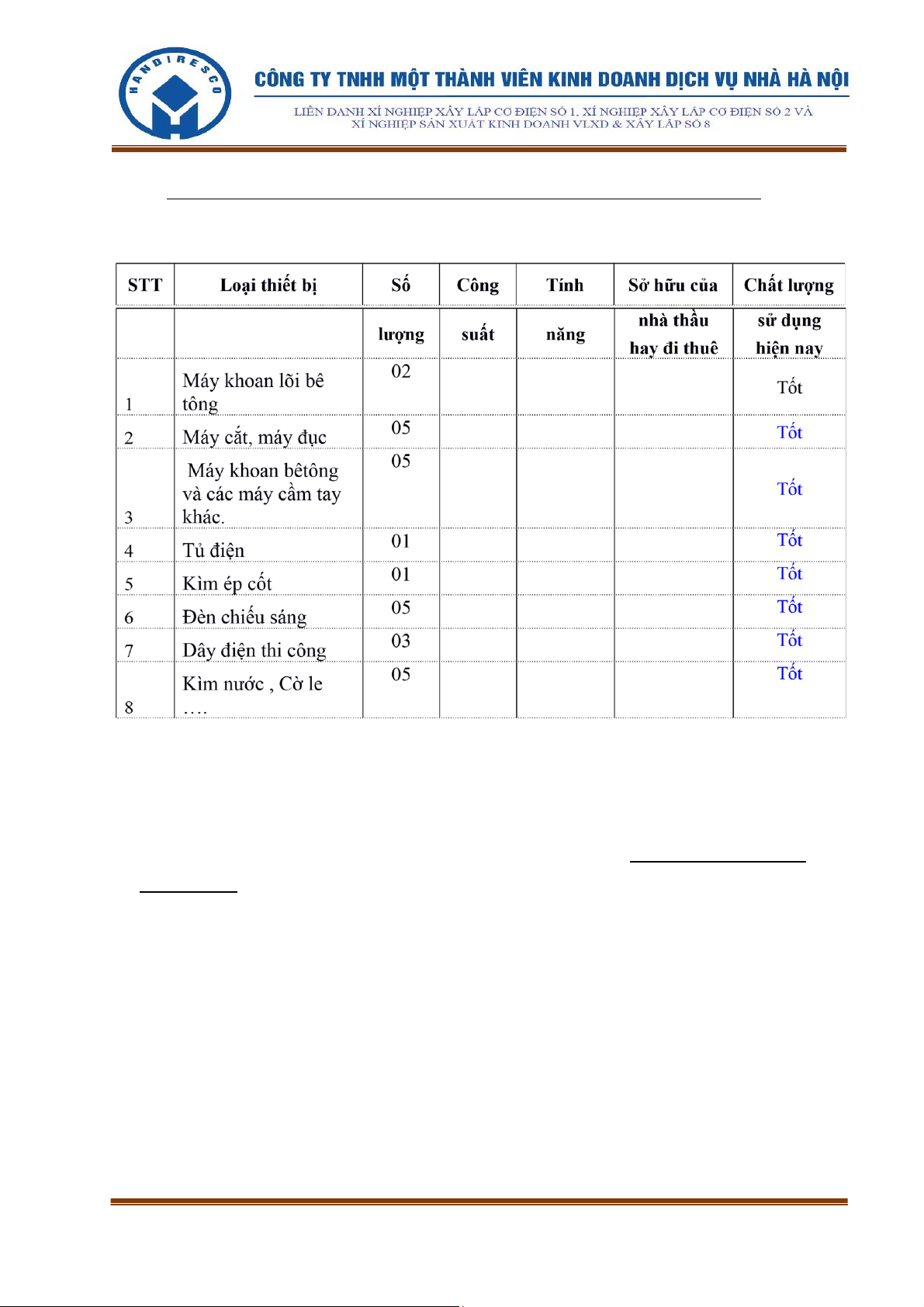chứng chỉ kiểm định và đáp ứng các tiêu chuẩn Việt Nam hiện hành (xem bảng kê thiết bị thi công). - Chuẩn bị nhân công: