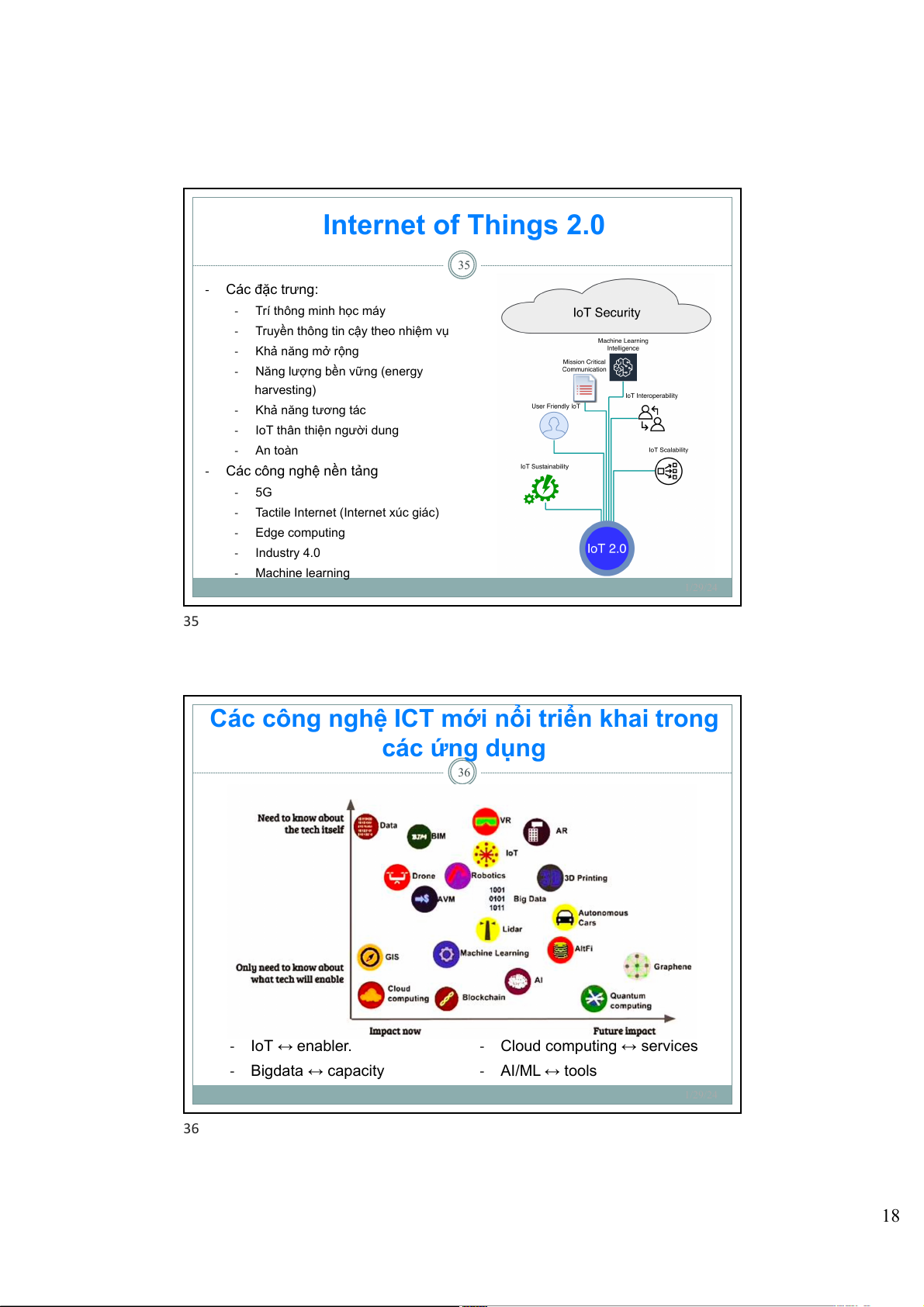 nối, nội dung, đám mây, bối cảnh, cộng tác và nhận thức 1/29/24 34 17 Internet of Things 2.0 35 - Các đặc trưng: - Trí thông minh học máy -